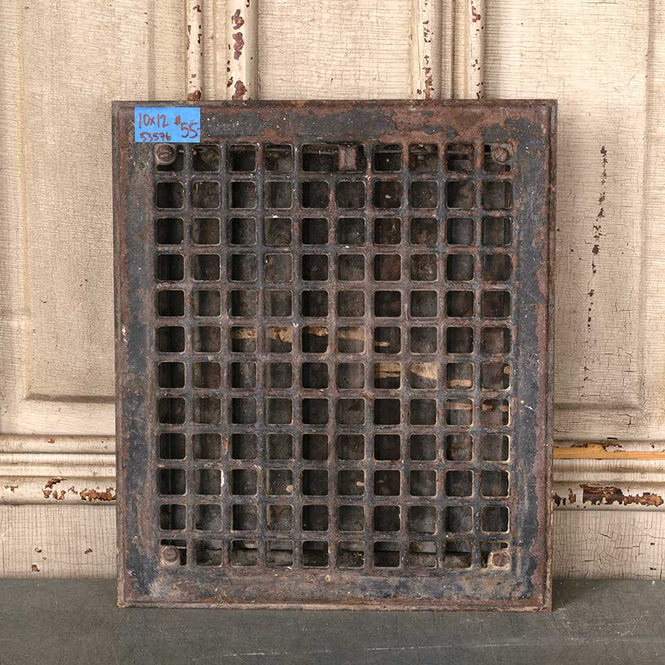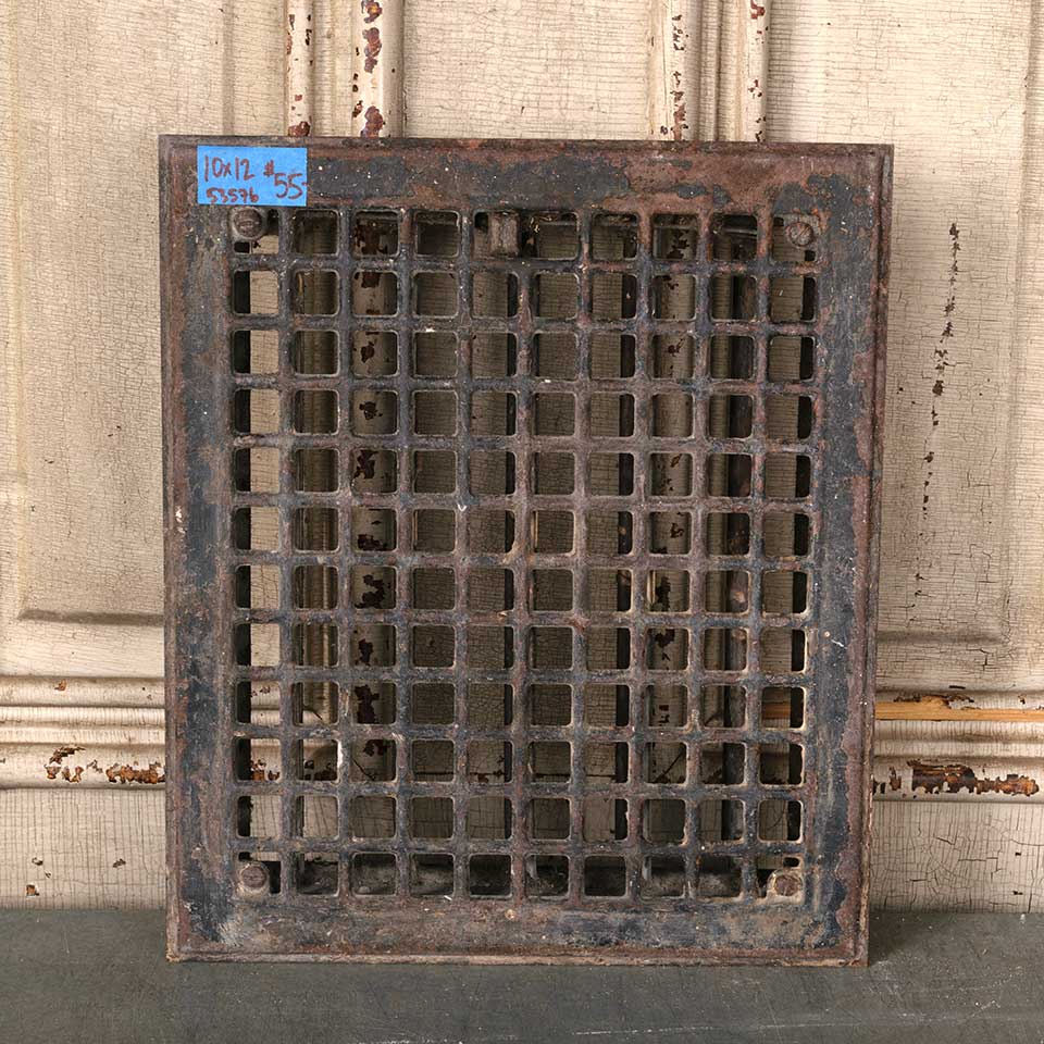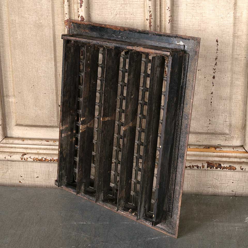 Architectural salvage antique pressed / stamped metal heat grate floor vent cover with operable louvers measuring approx. 10" x 12" (insert dimensions) and 12" x 13 15/16" (overall dimensions). See photos to evaluate condition.