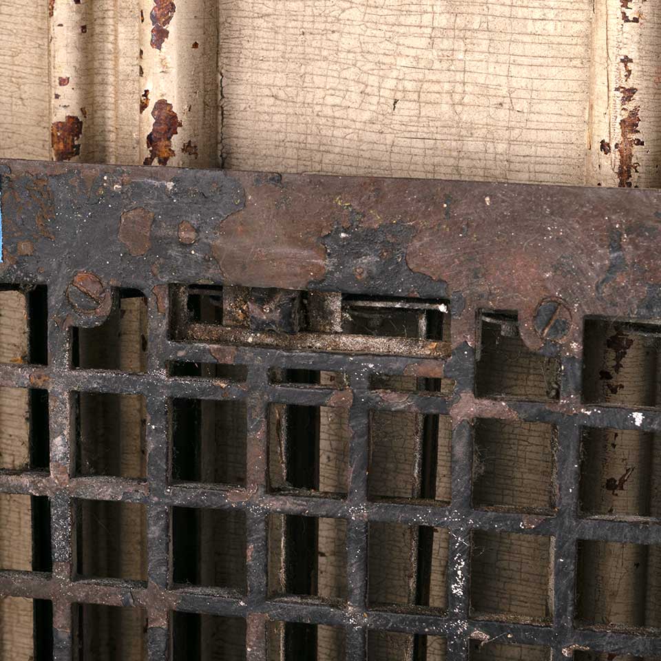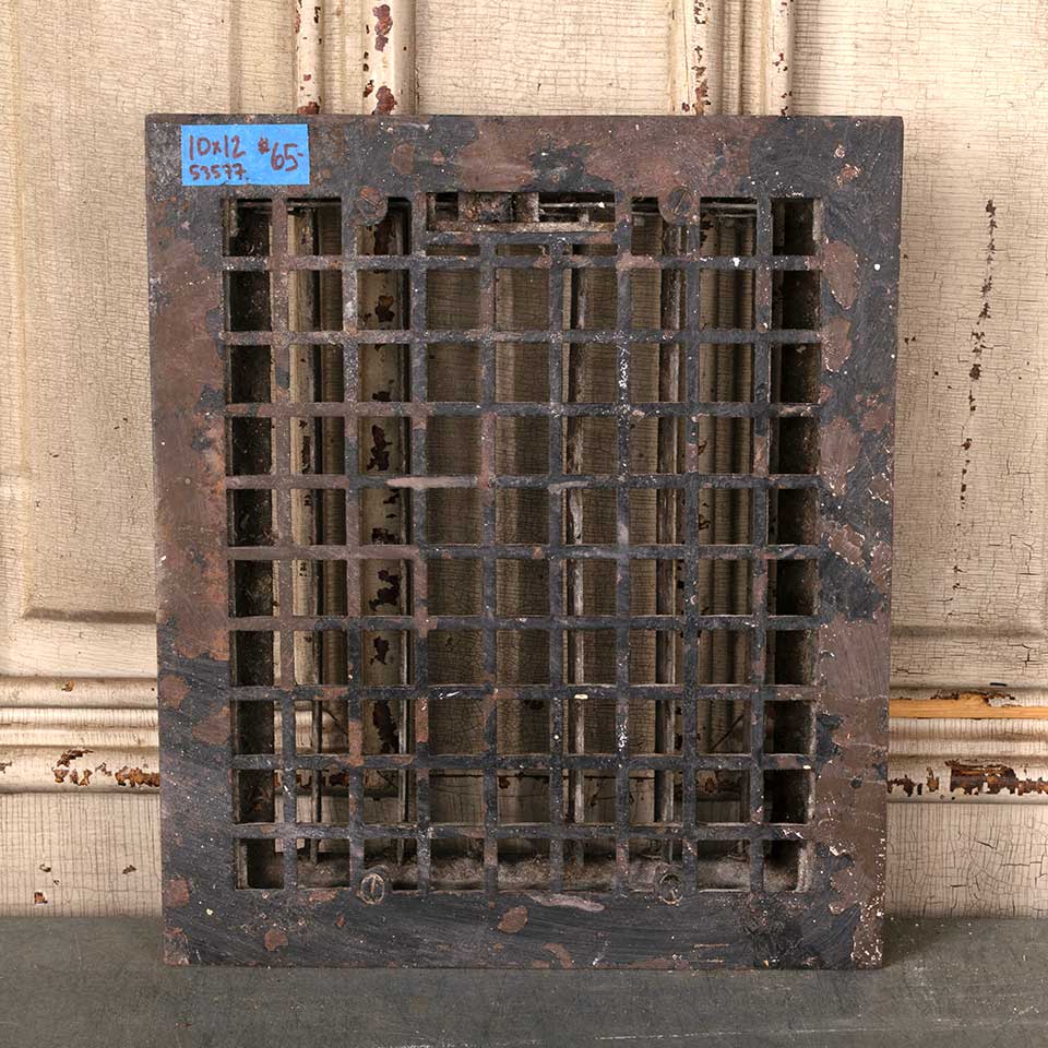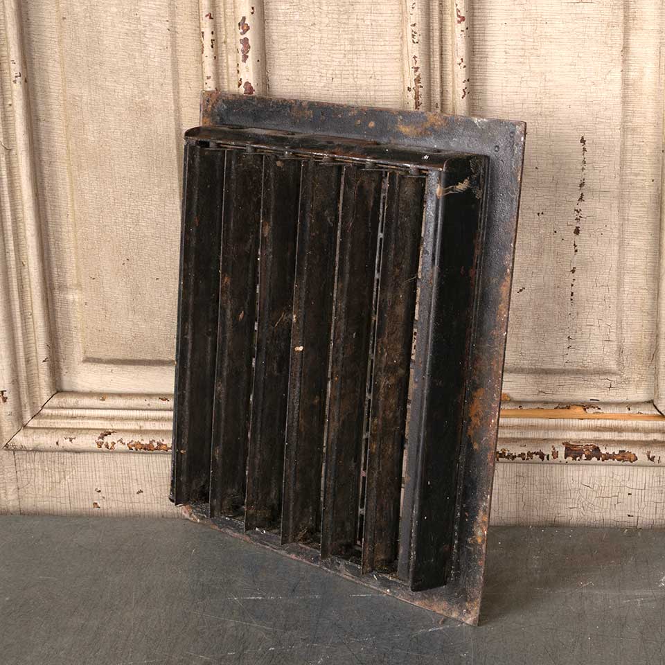 Architectural salvage antique cast iron heat grate floor vent cover with operable louvers measuring approx. 10" x 12" (insert dimensions) and 11 15/16" x 14" (overall dimensions). See photos to evaluate condition.