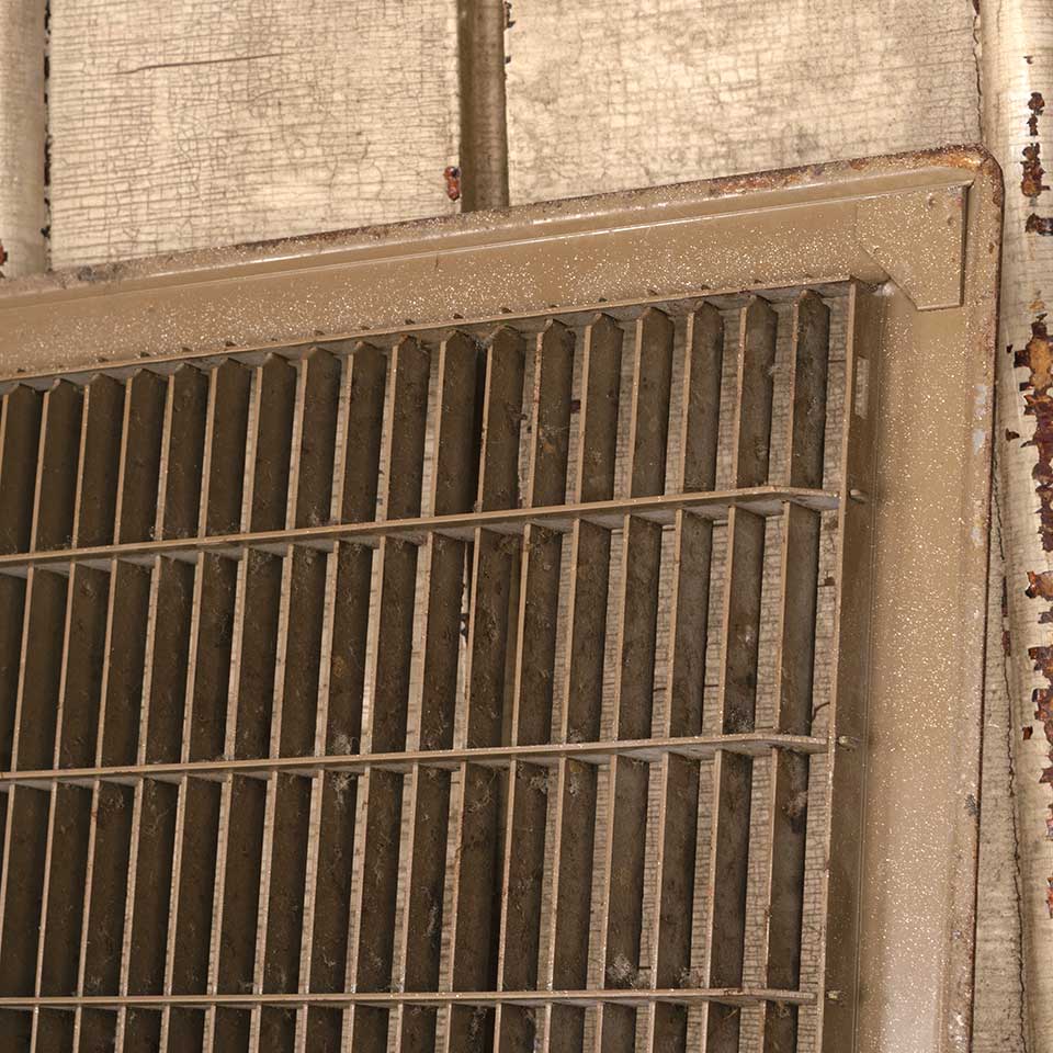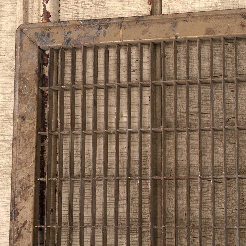 Architectural salvage vintage metal cold air return floor grate vent cover measuring approx. 13 5/8" x 29 3/4" (insert dimensions) and 15 13/16" x 31 15/16" (overall dimensions). See photos to evaluate condition.