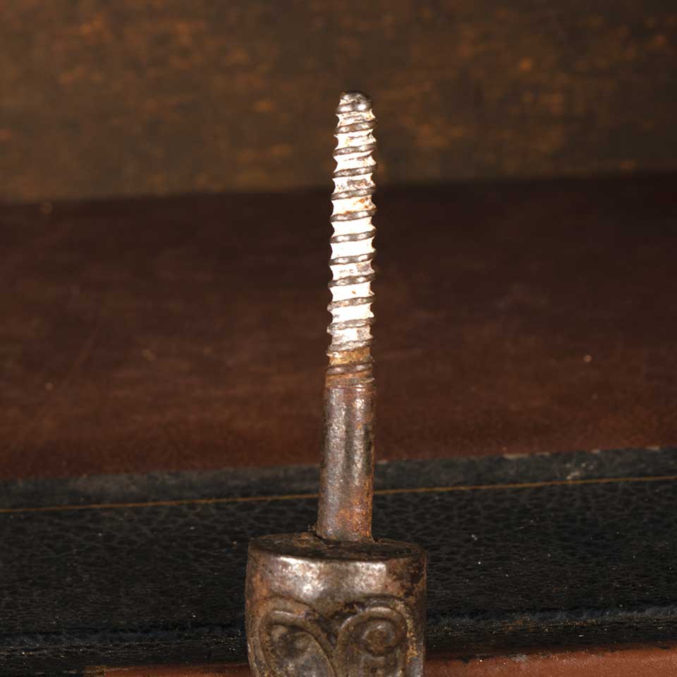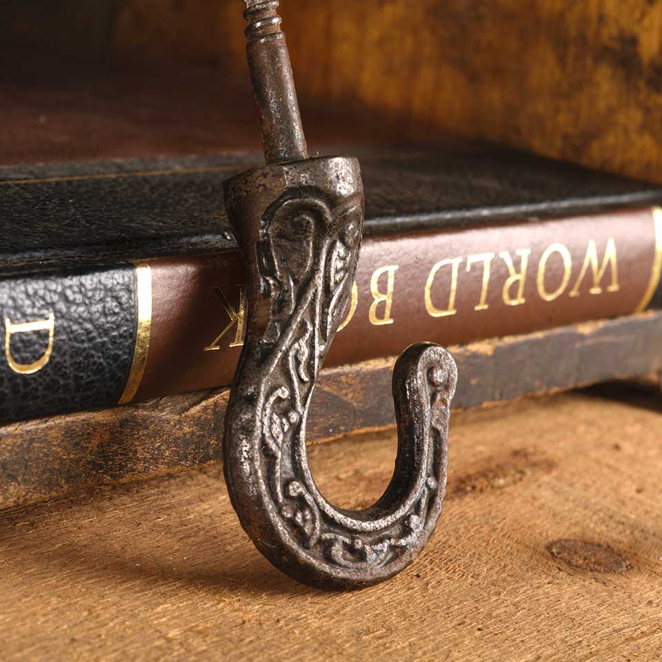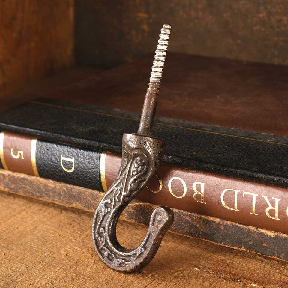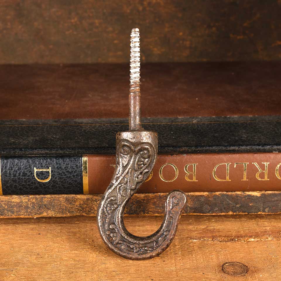 Architectural salvage antique ornate cast iron Victorian chandelier ceiling hook with integral wood screw measuring approx. 1 3/4" wide x 4 1/2" tall (hook itself is 2 1/2" tall). See photos to evaluate condition.