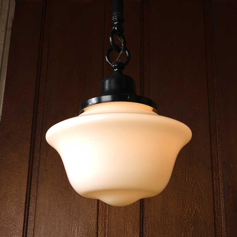 Architectural salvage Rejuvenation single bulb pendant light fixture with milk glass schoolhouse globe measuring approx. 11 1/2" in diameter x 24" tall x with a 10" diameter ceiling canopy. Color and condition may vary. Salvaged lighting should be inspected by a licensed electrician prior to installation.