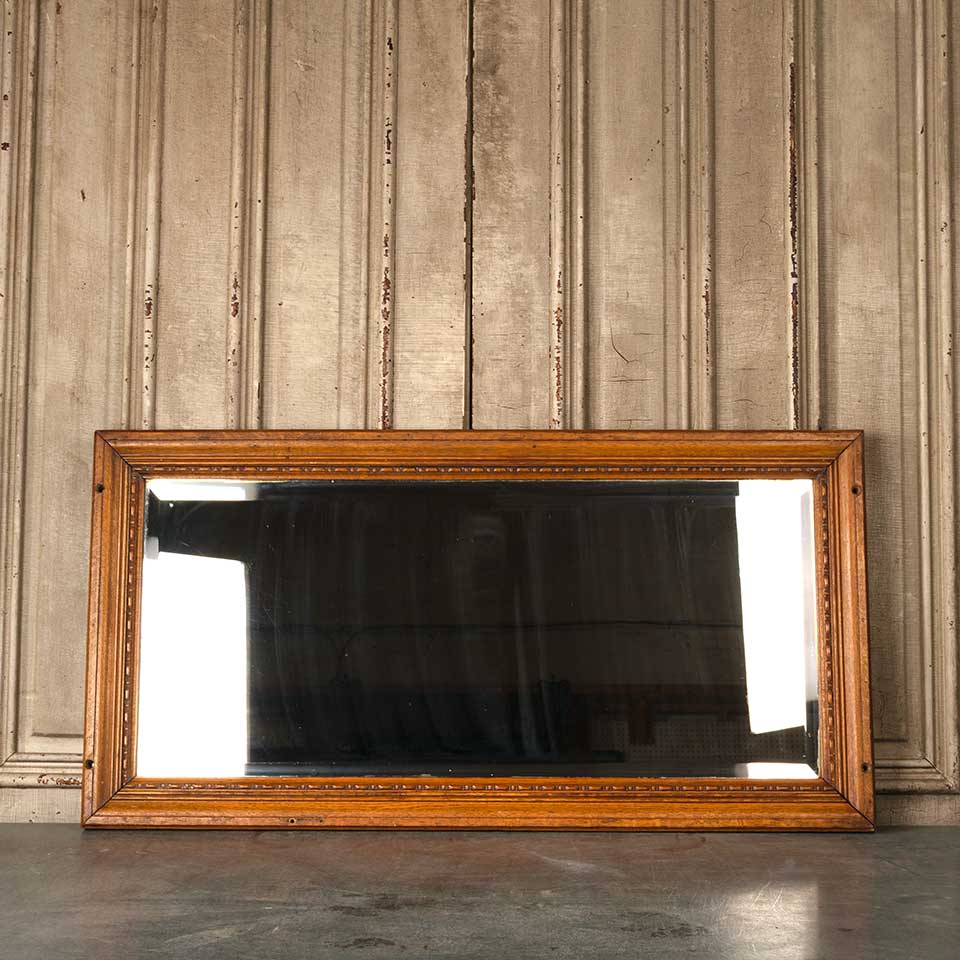 Architectural salvage antique oak wood framed beveled glass mirror measuring approx. 23 1/8" x 45" x 1 3/4" front to back. There are some holes drilled through the frame. See photos to evaluate condition.