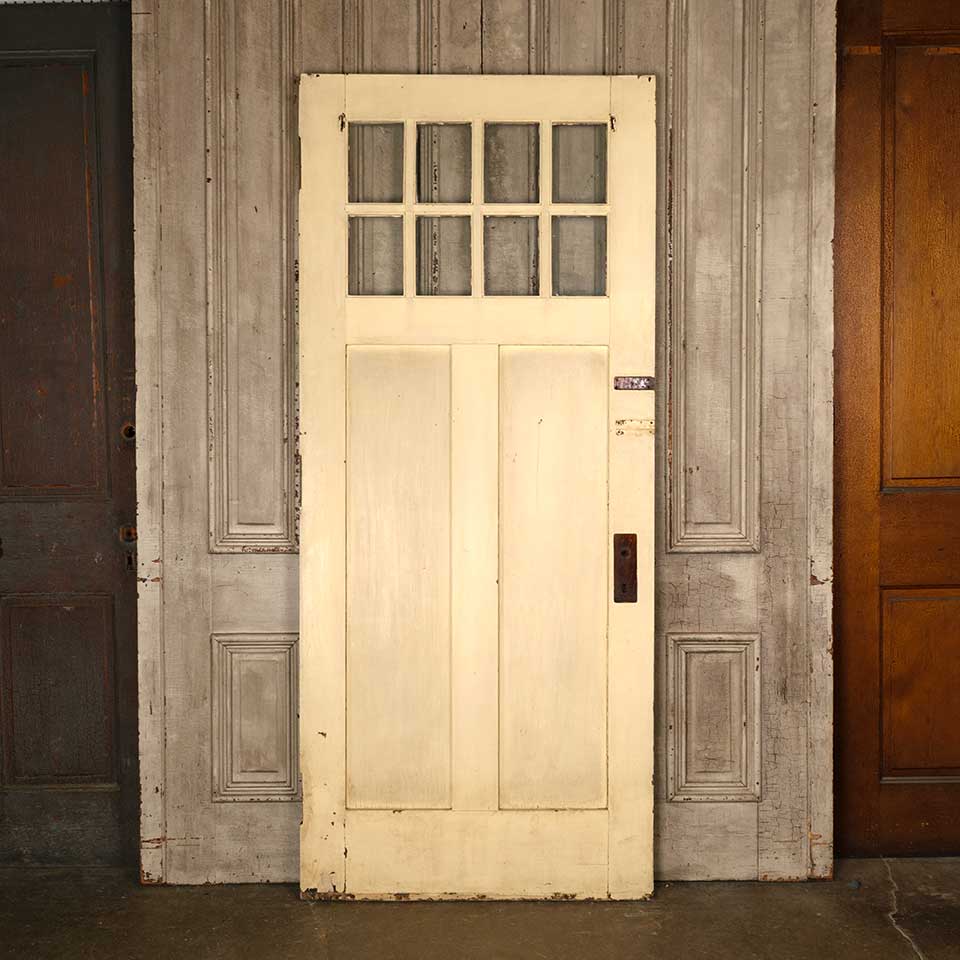 Architectural salvage antique divided lite wood window sash measuring approx. 36 1/4" wide x 33 1/4" tall x 1 3/8" thick. One of the glass panes is cracked. See photos to evaluate condition.