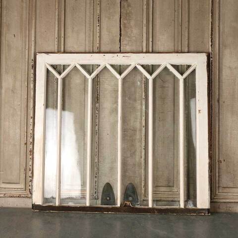 Architectural salvage antique divided lite wood window sash measuring approx. 36 1/4" wide x 33 1/4" tall x 1 3/8" thick. Two of the glass panes are cracked. See photos to evaluate condition.