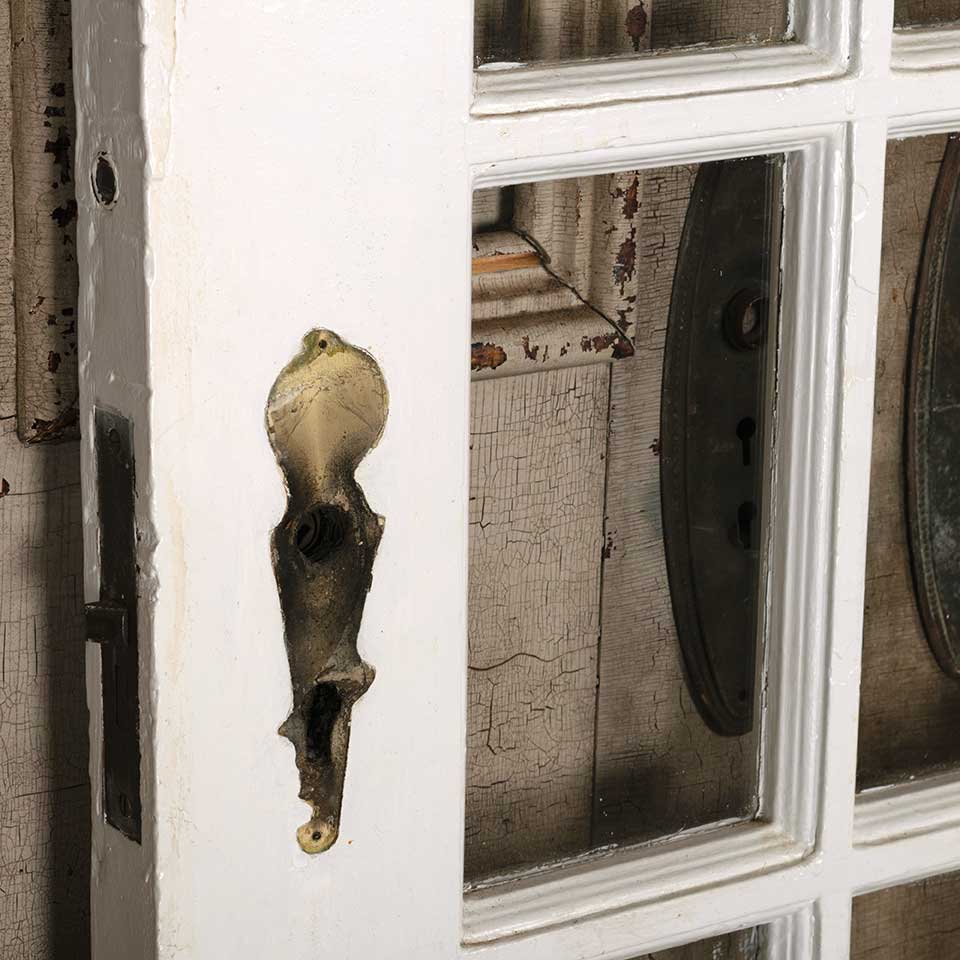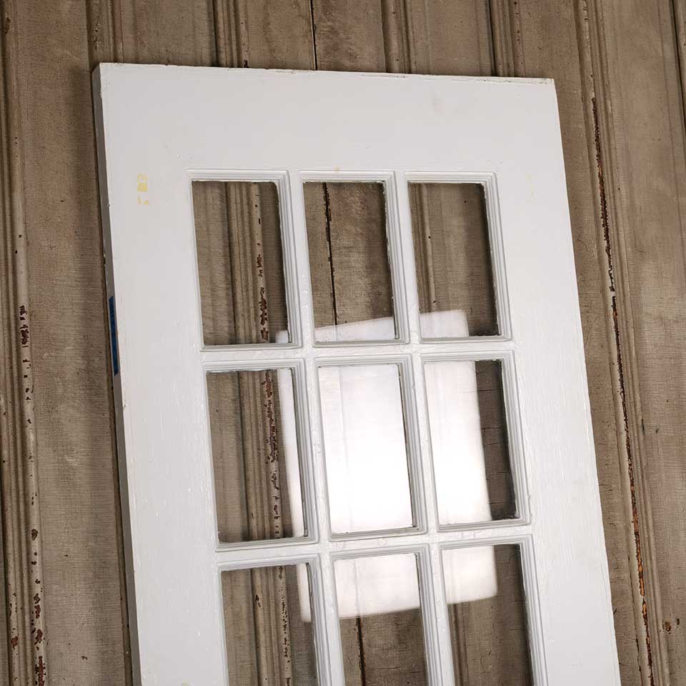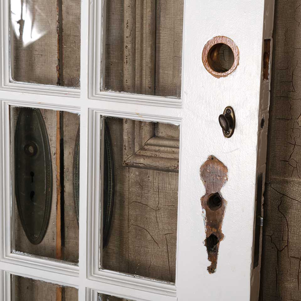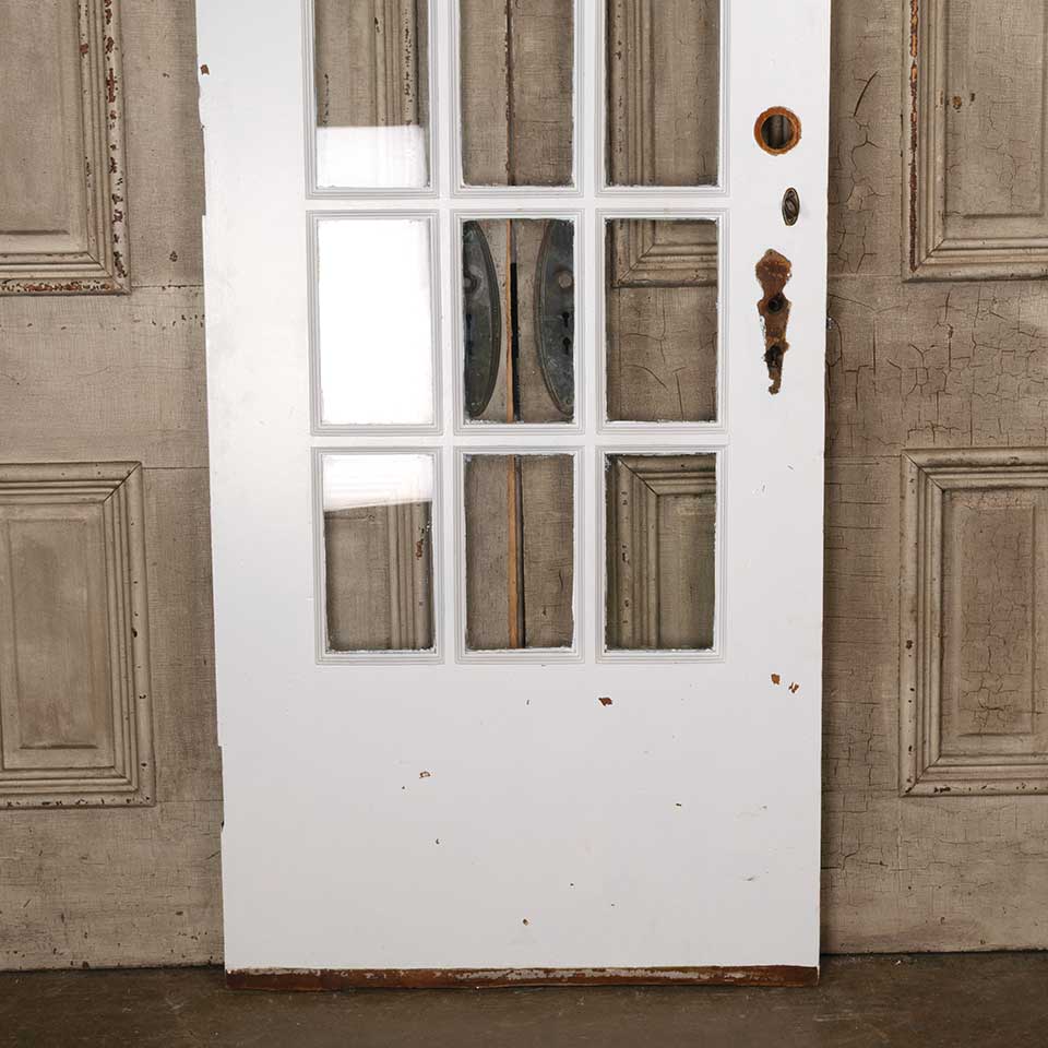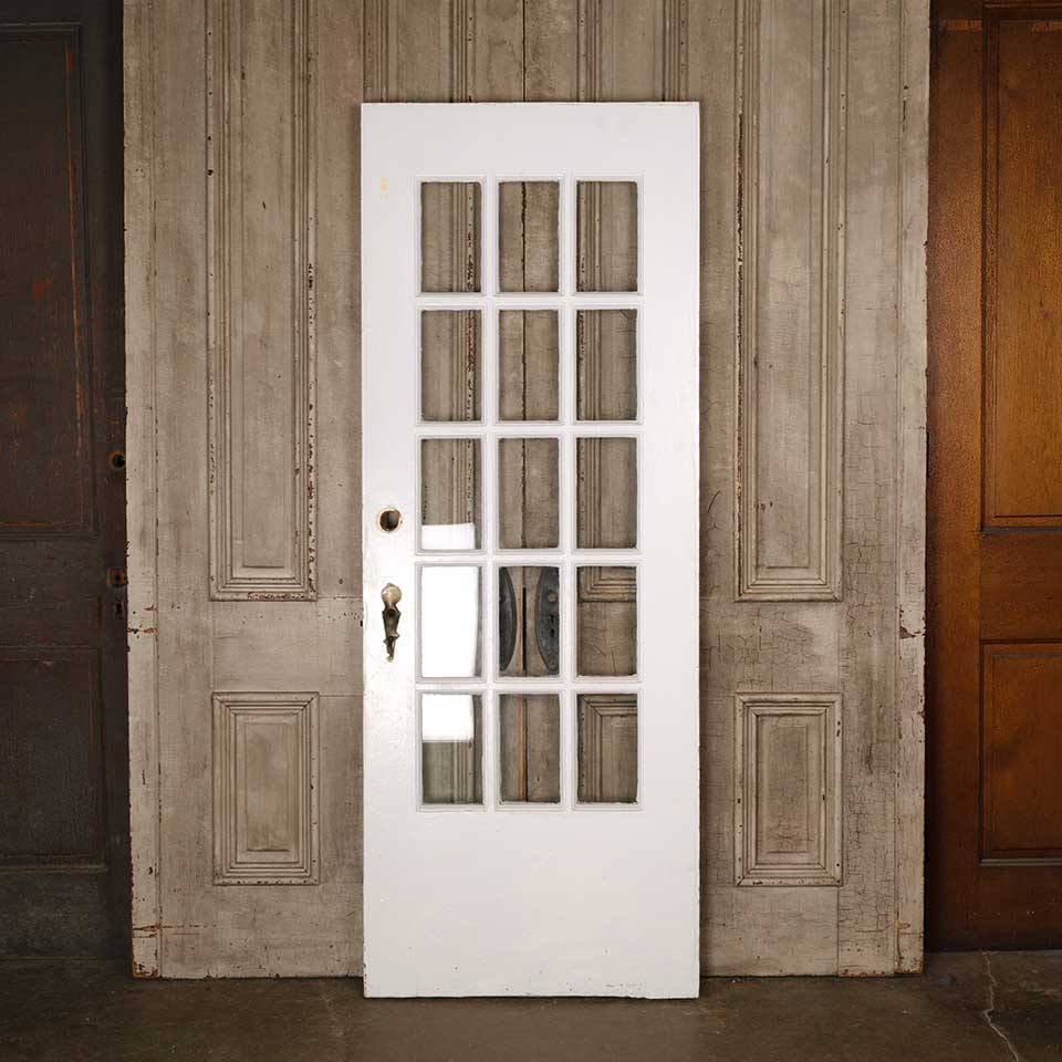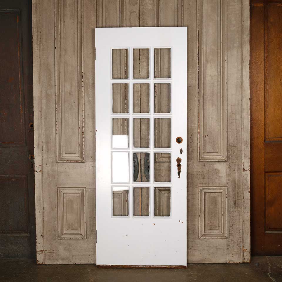 Architectural salvage fifteen lite painted wood French entry door with mortise lock and thumb latch measuring approx. 29 5/8" wide x 78 7/8" tall x 1 3/4" thick. See photos to evaluate condition.