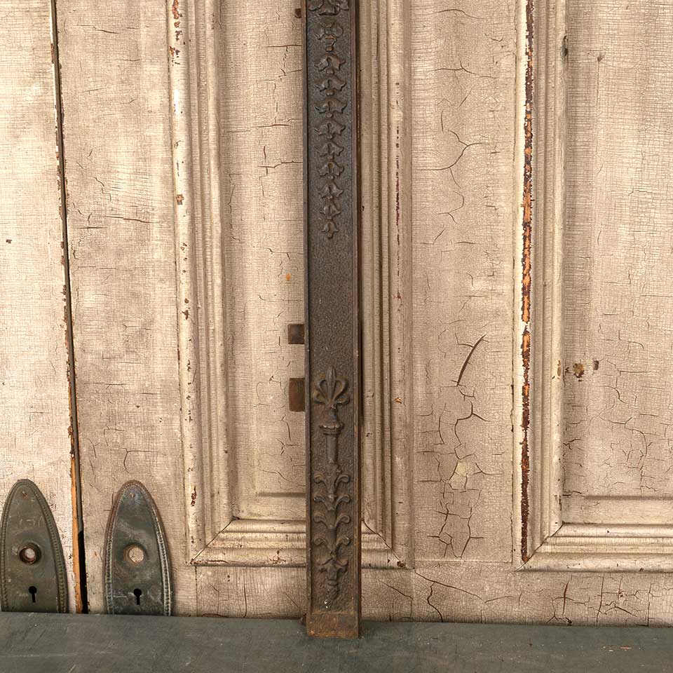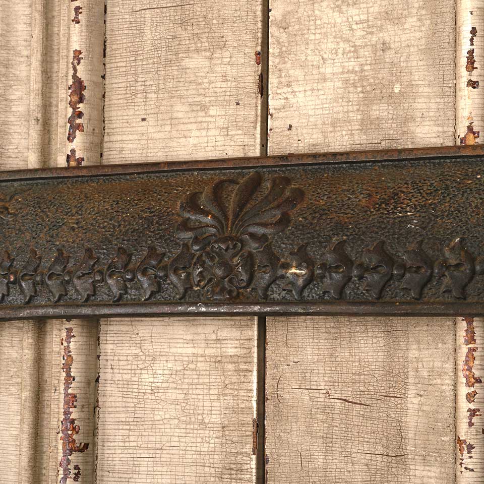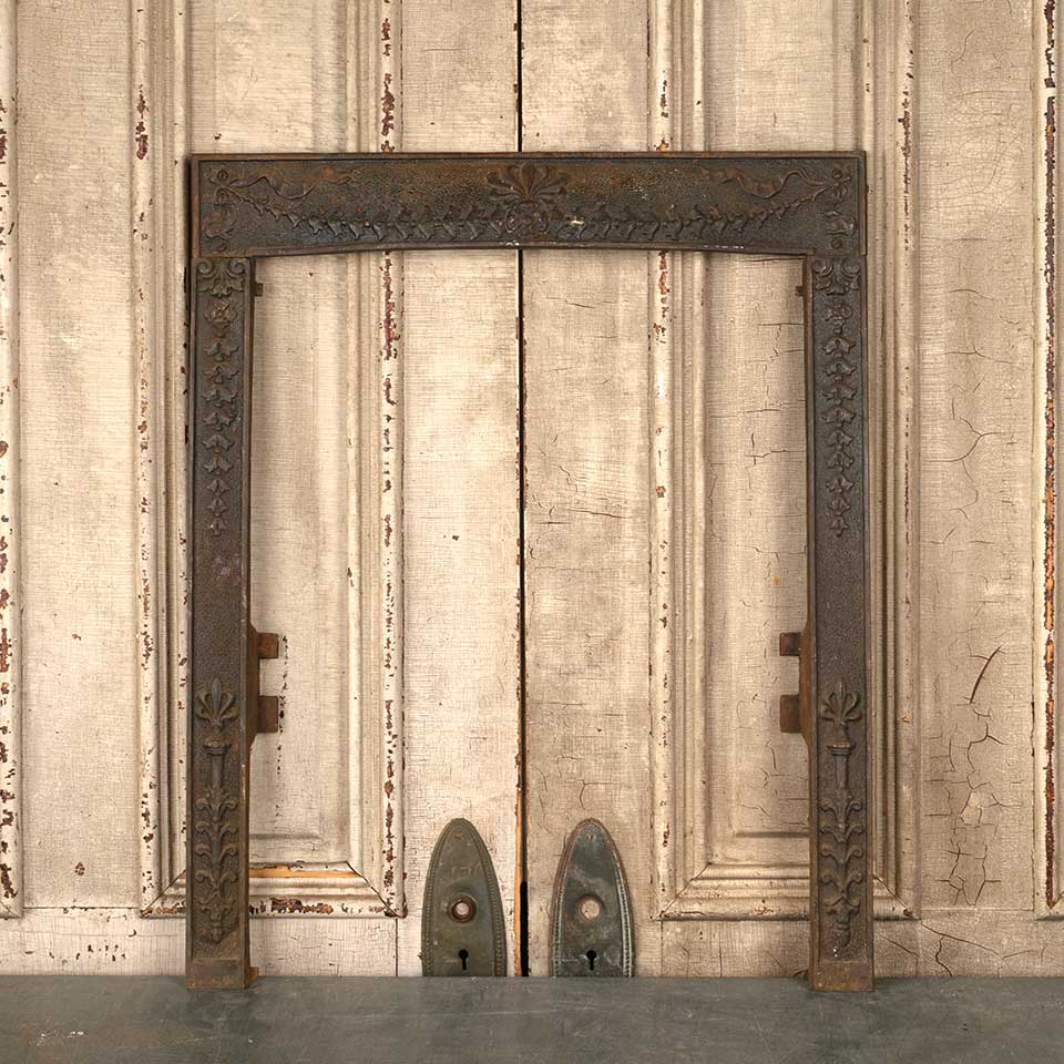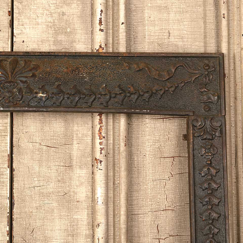 Architectural salvage antique cast iron fireplace surround measuring approx. 24 5/8" wide x 30 1/4" tall x 3 1/2" front to back. The interior firebox opening measures approx. 20" wide x 26 3/8" tall. See photos to evaluate condition.