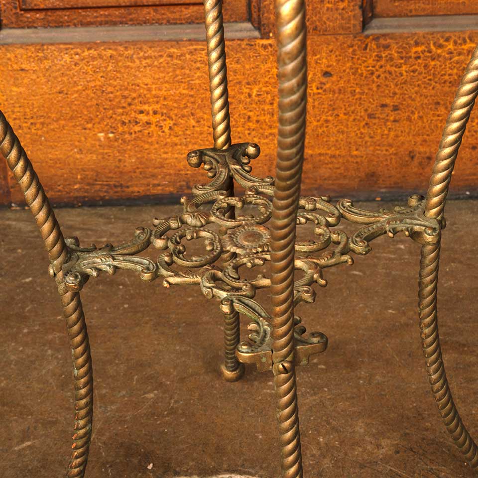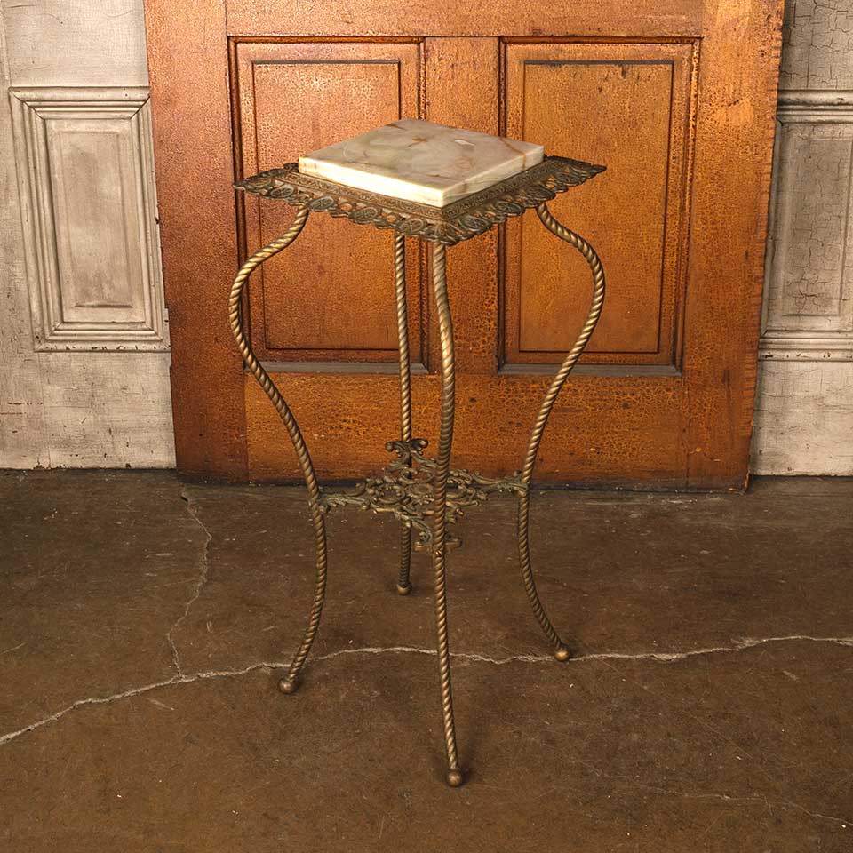Ornate antique brass plant stand with removable marble top measuring approx. 12 1/4" x 12 1/4" x 29 1/4" tall. See photos to evaluate condition.