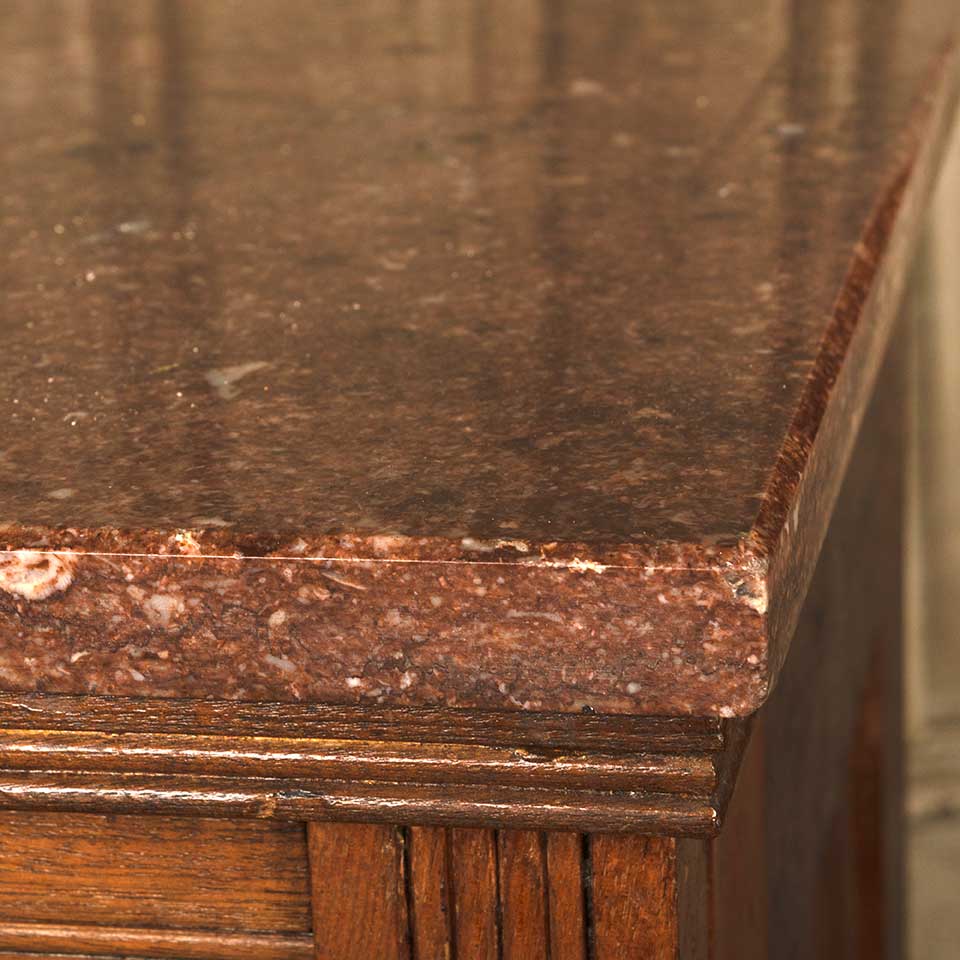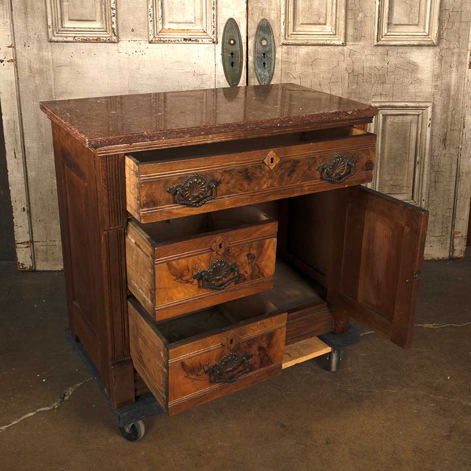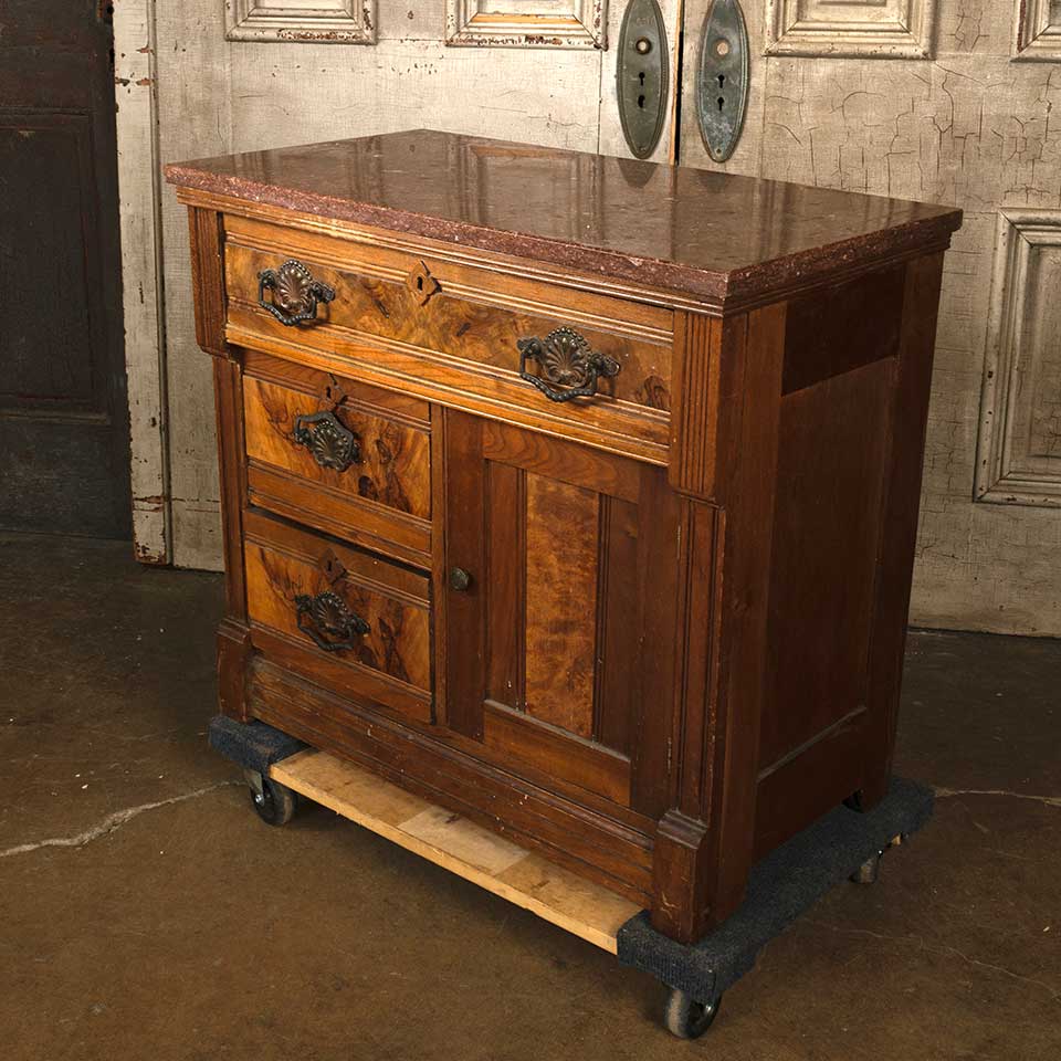 Antique Victorian walnut wood dry sink cabinet with removable marble top measuring approx. 30 1/8" wide x 26 7/8" tall x 16" front to back. It appears that the original marble backsplash gallery is missing. See photos to evaluate condition.
