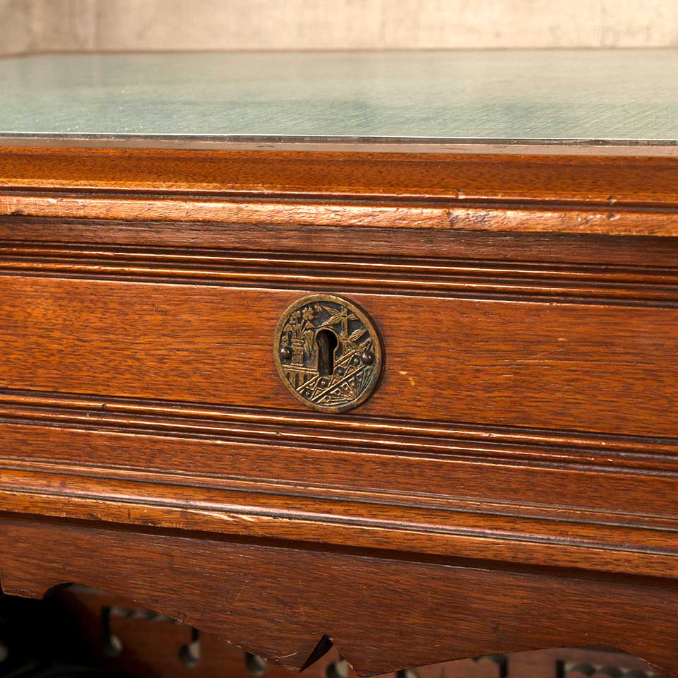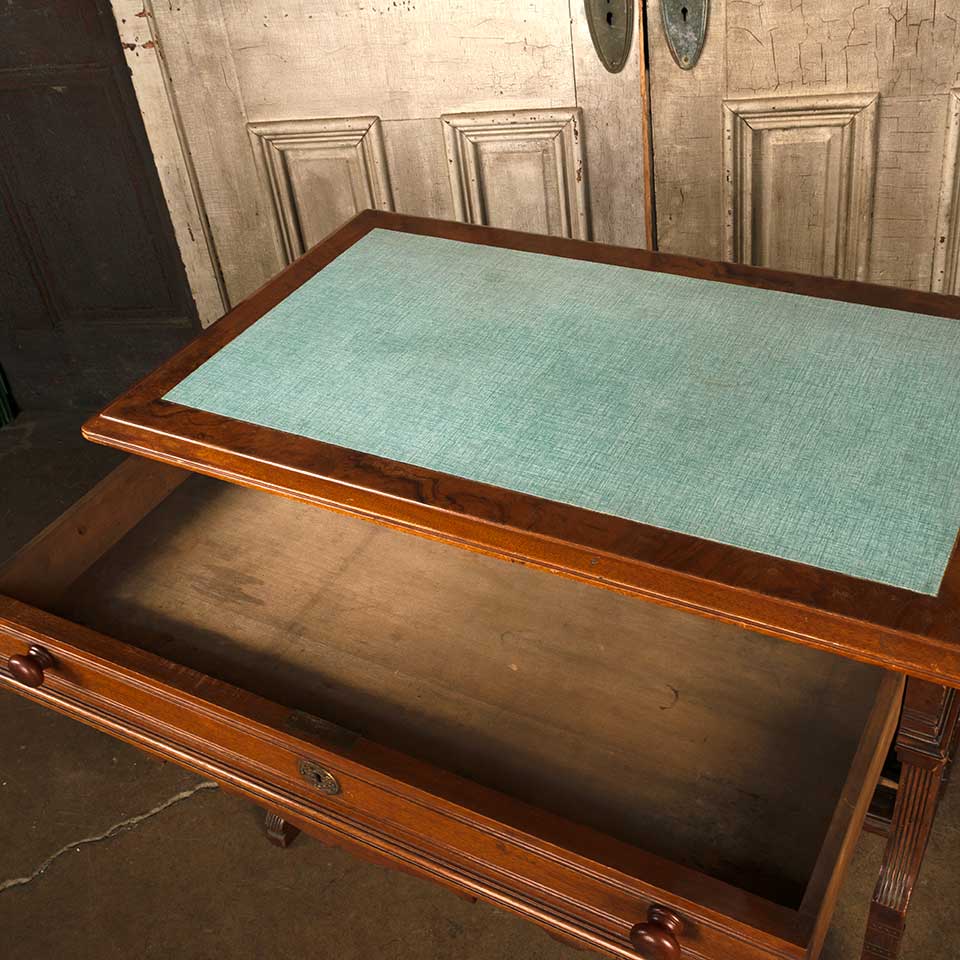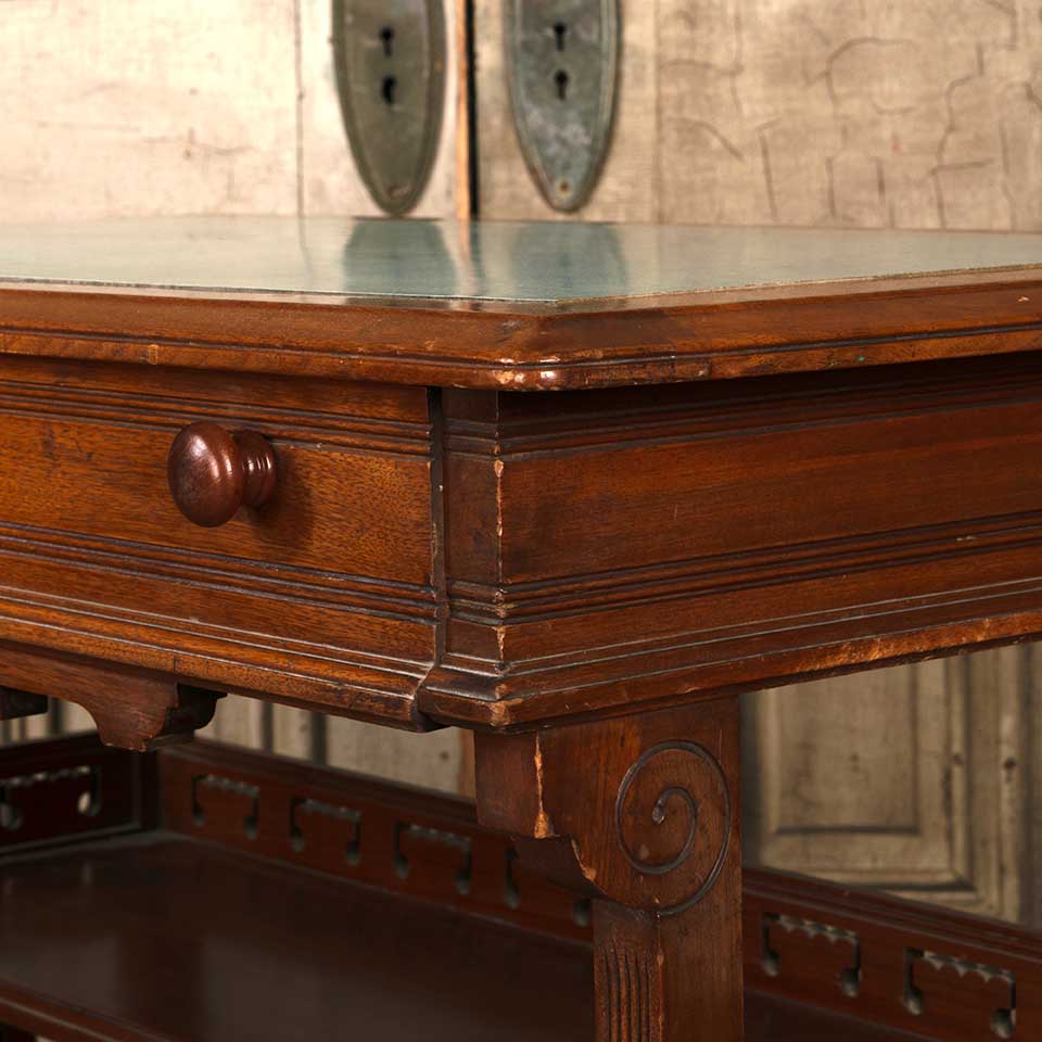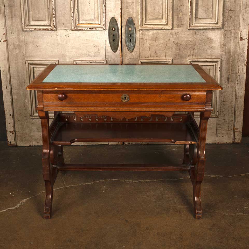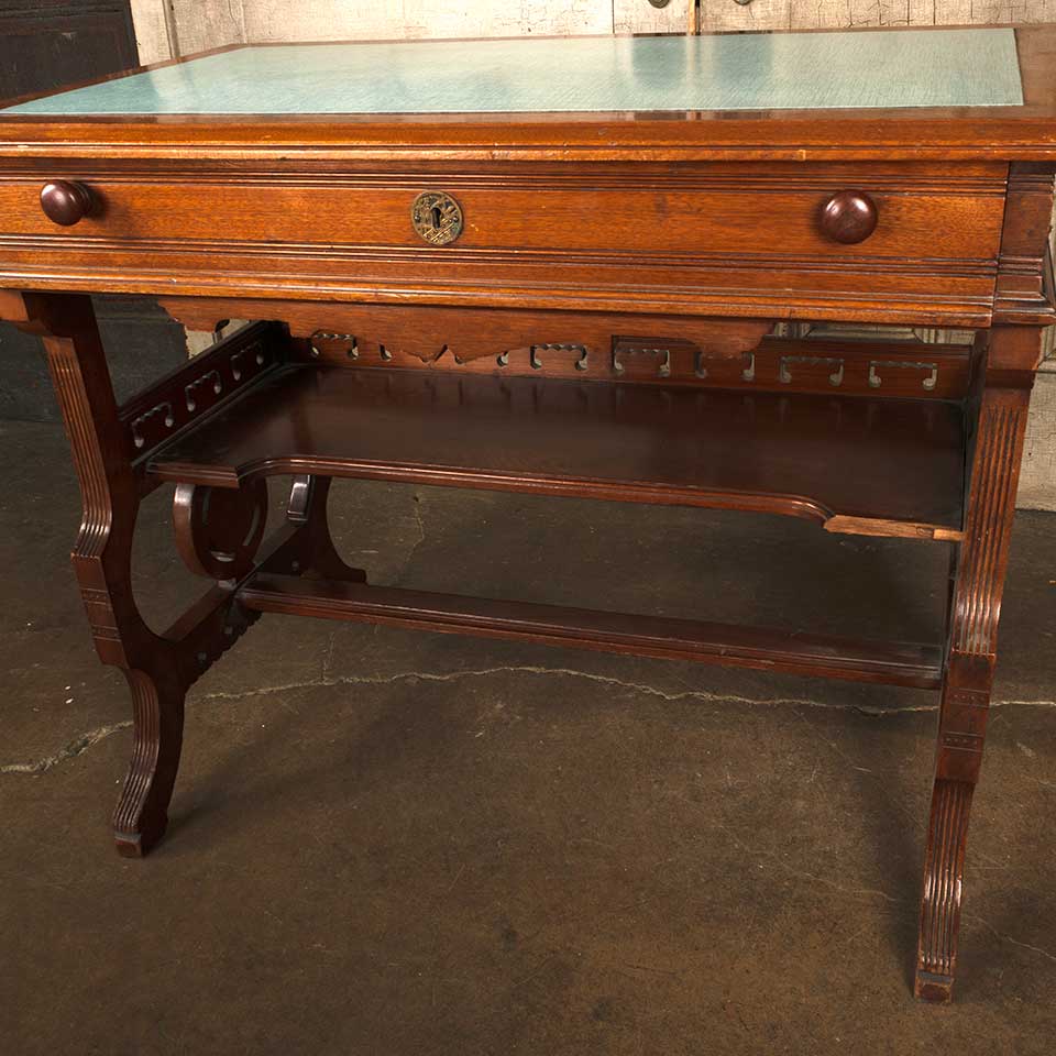 Antique Victorian walnut wood library writing desk with drawer and shelf measuring approx. 36" wide 29" tall x 21" front to back. The desk top looks to have been replaced at some point in it's history. There's some wood loss at the right side of the shelf. See photos to evaluate condition.