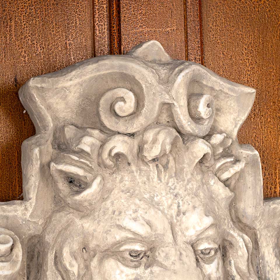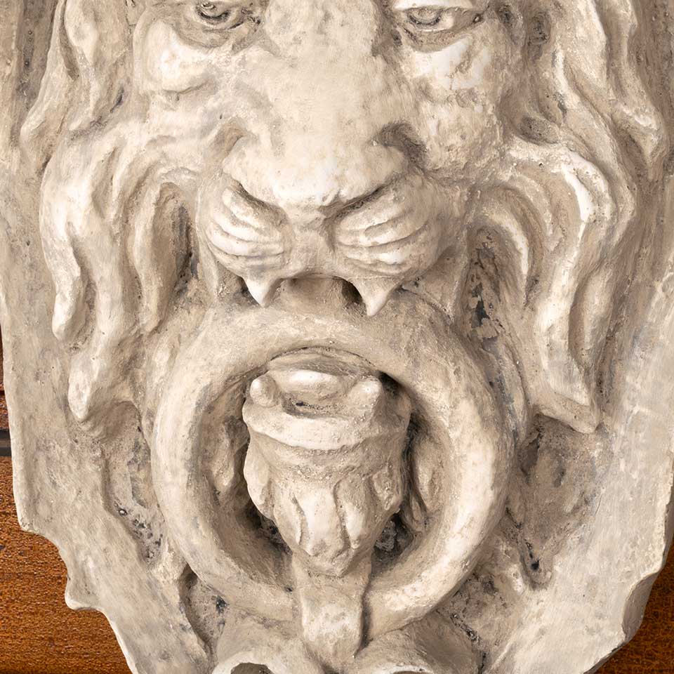 Large cast plaster lion door knocker wall plaque measuring approx. 25" wide x 29 1/2" tall x 6 1/4" front to back. See photos to evaluate condition.