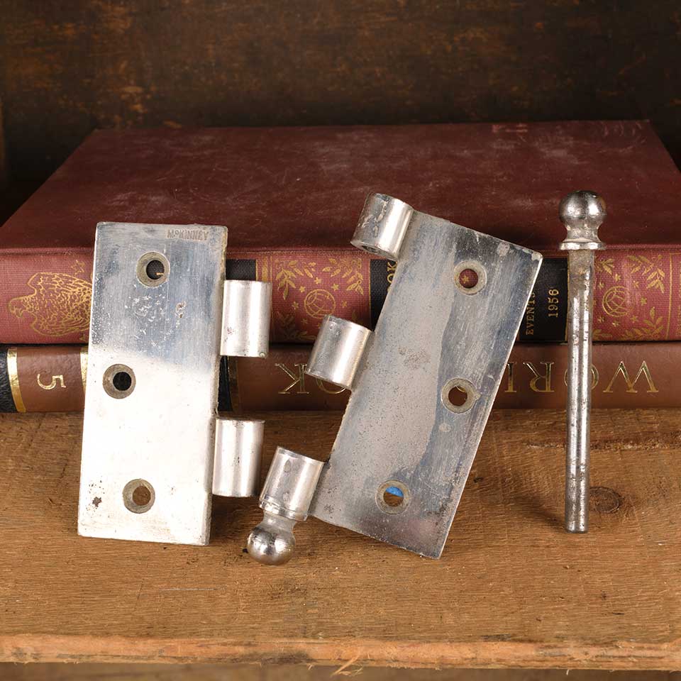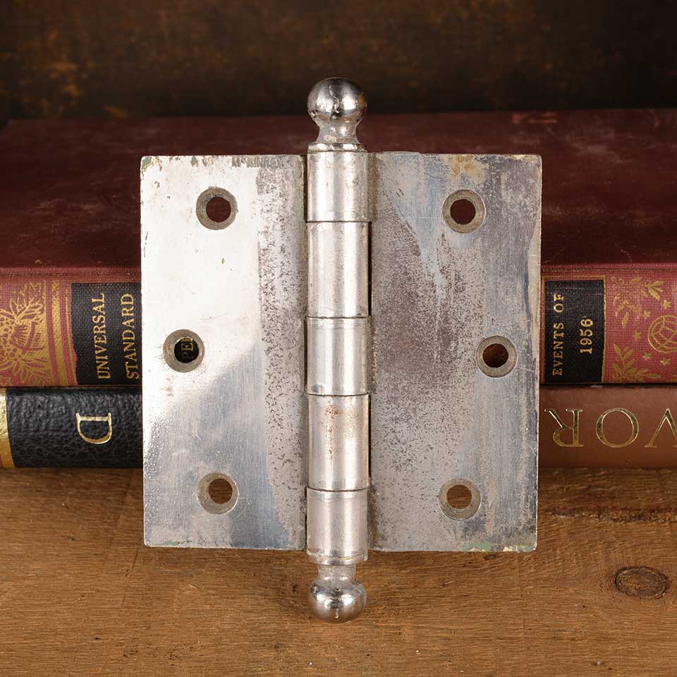 Architectural salvage McKinney chrome-plated door butt hinge with ball finials measuring approx. 3" square (4 3/4" tall including finials). Color and condition may vary.