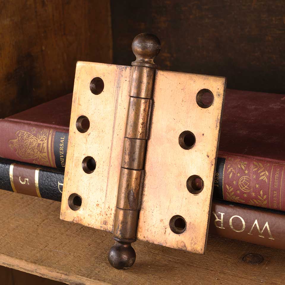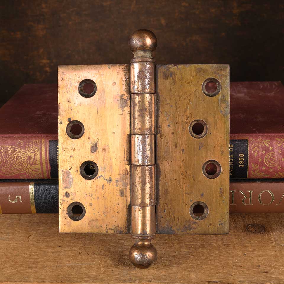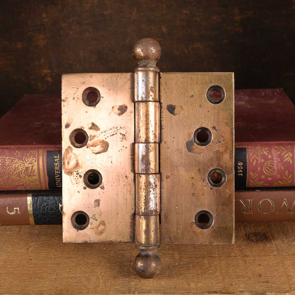 Architectural salvage antique steel door butt hinge hardware with ball finials measuring approx. 4" square (5 1/2" tall including finials). Color and condition may vary.
