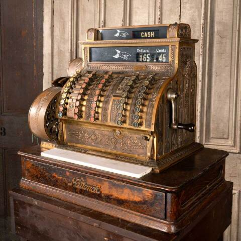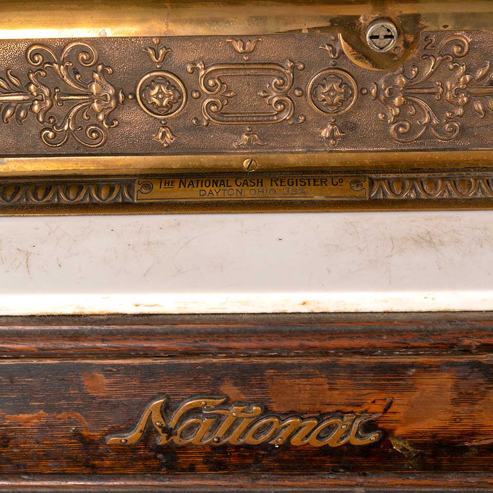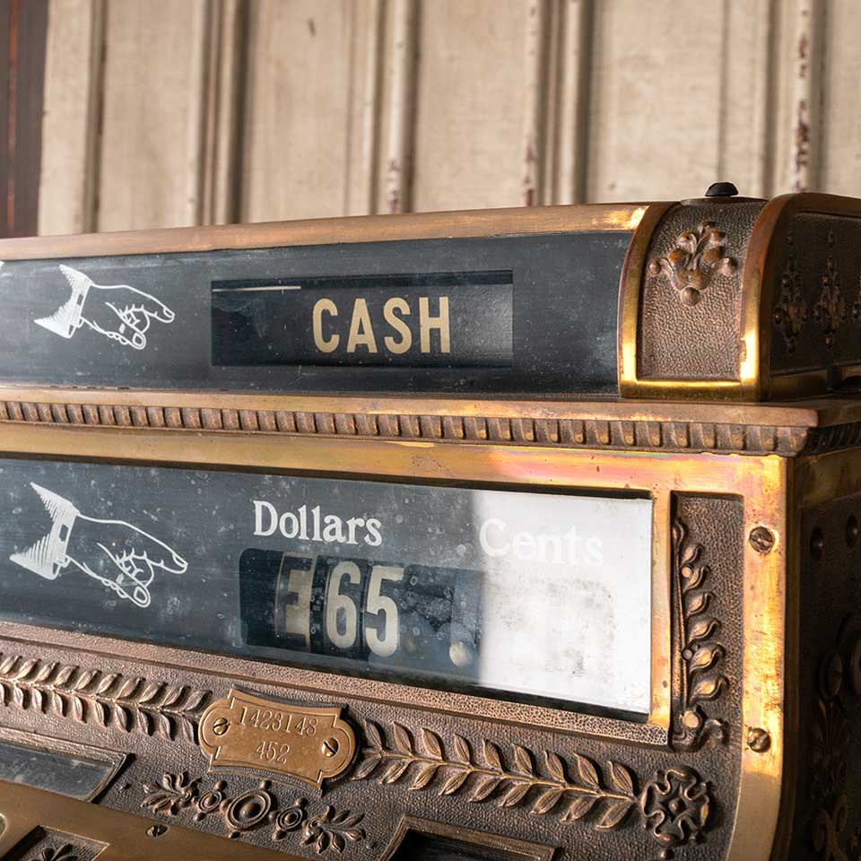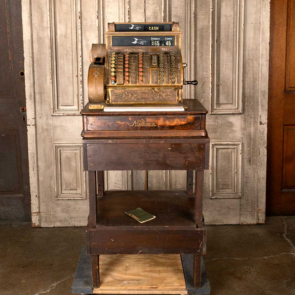 Antique working store counter National Cash Register (model 452) measuring approx. 25 1/4" wide x 22 tall x 16 3/4" front to back. This piece was manufactured by The National Cash Register Company of Dayton, Ohio and comes with the original How to Use Your National Cash Register booklet. The wood base is not original but is included and measures approx. 24 3/4" wide x 33" tall x 20" front to back. The original brass pediment is missing. See photos to evaluate condition.