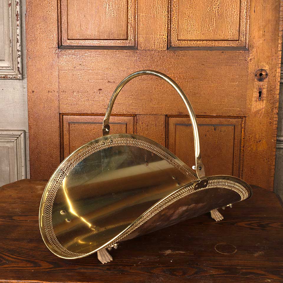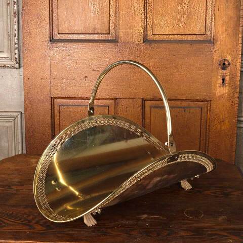 Vintage metal footed fireside log holder basket with handle measuring approx. 14" wide x 16" tall (with handle all the way up) x 21" front to back. See photos to evaluate condition.