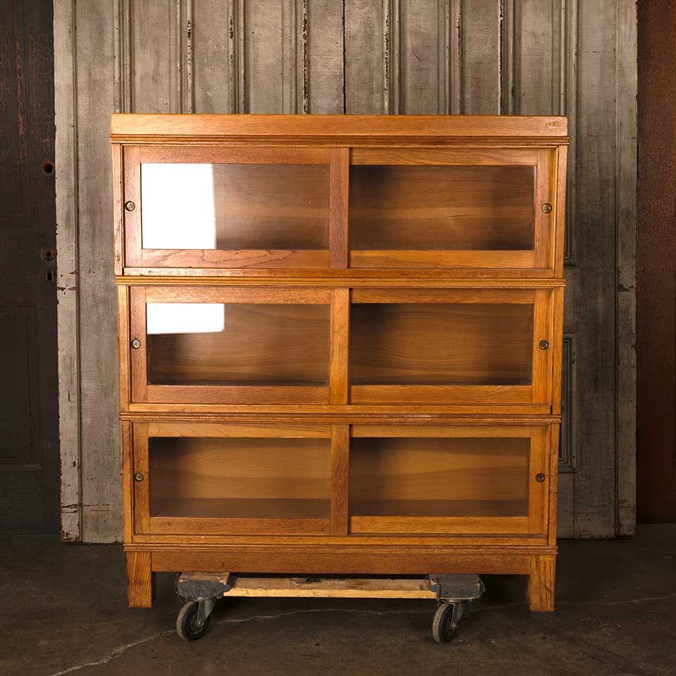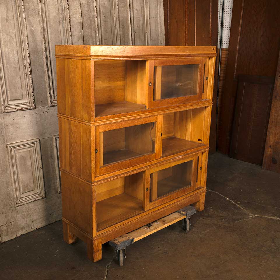 Architectural salvage vintage mid century modern five piece stackable wood bookcase unit with sliding glass doors measuring approx. 43 1/4" wide x 49 1/4" tall x 13 1/4" front to back. The unit consists of a top, three shelving units, and a base. This piece was used at The Ohio State University. See photos to evaluate condition.
