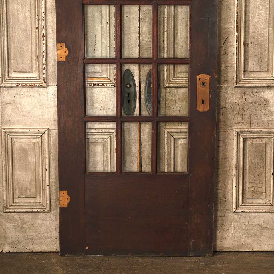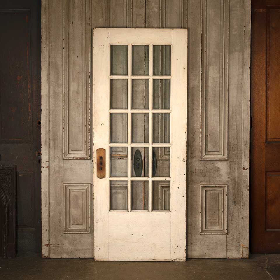 Architectural salvage antique fifteen lite wood French entry door with mortise lock measuring approx. 31 3/4" wide x 79 5/8" tall x 1 3/8" thick. This door is painted on the exterior and natural on the interior. See photos to evaluate condition.