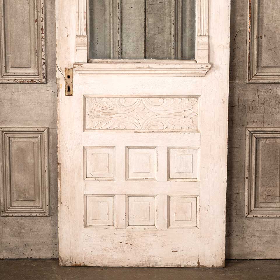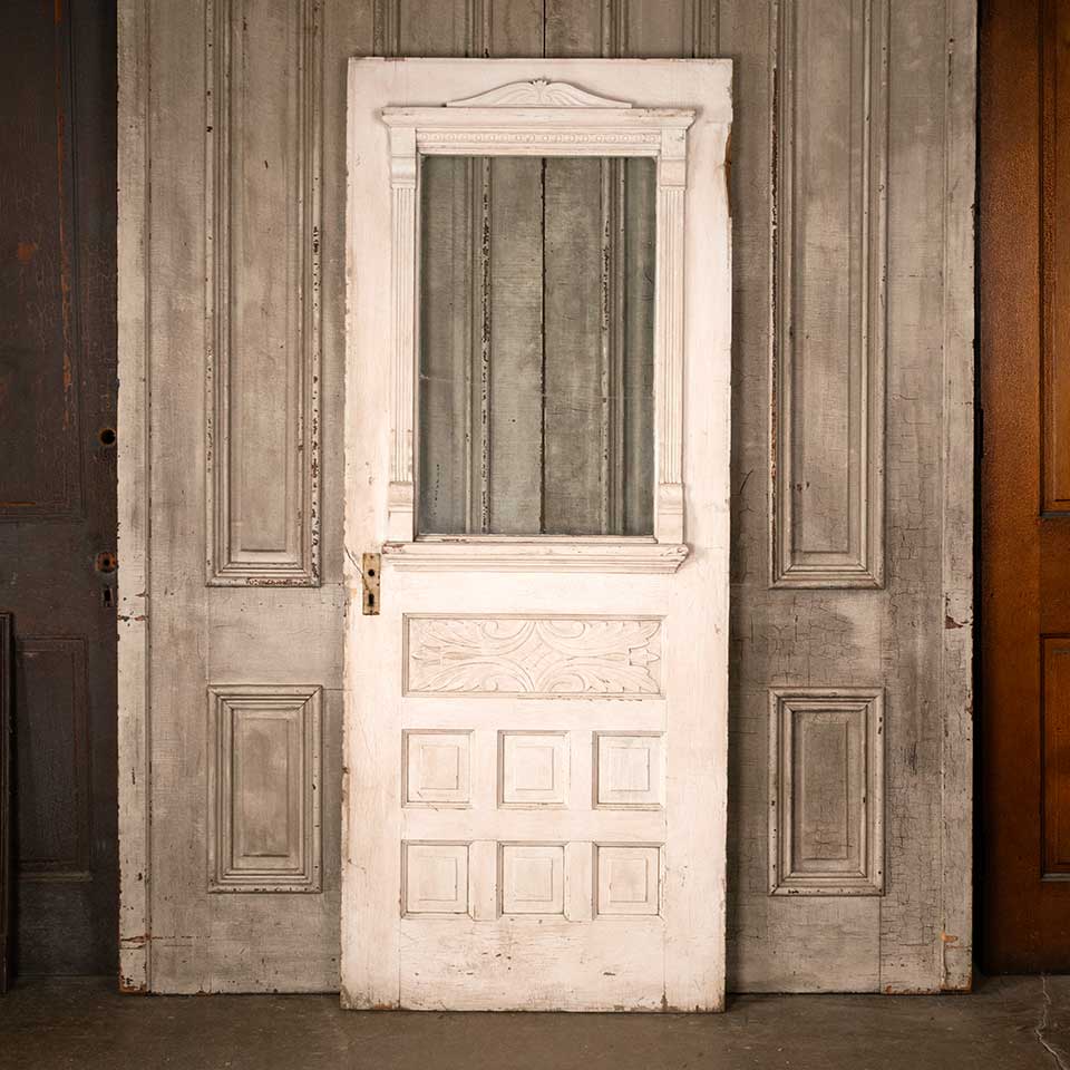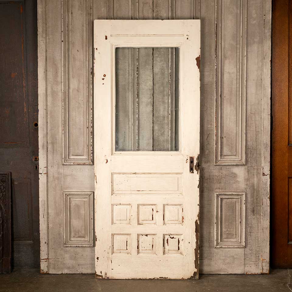 Architectural salvage antique Victorian half lite painted wood entry door measuring approx. 32" wide x 78 7/8" tall x 1 3/8" thick. There's some damage / wood loss at the mortise lock and top hinge pocket and the original wavy glass is cracked. See photos to evaluate condition.