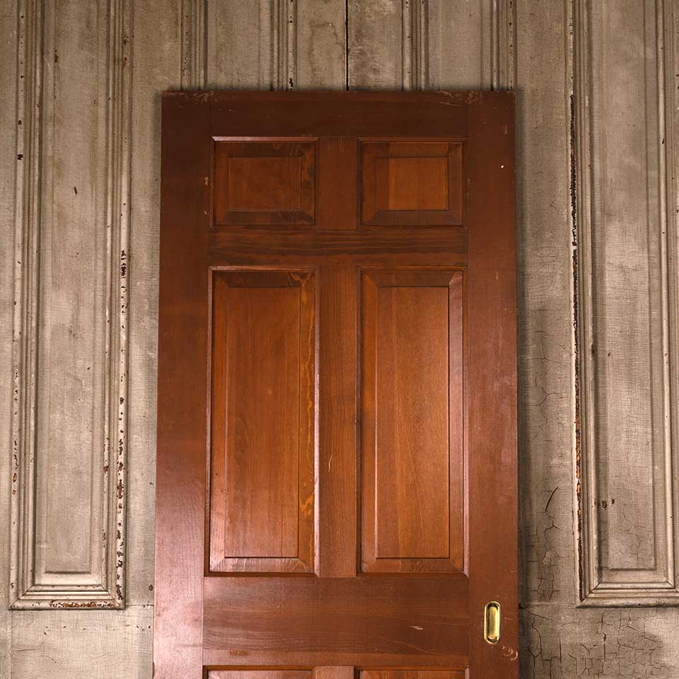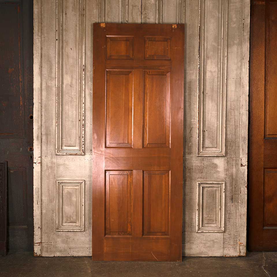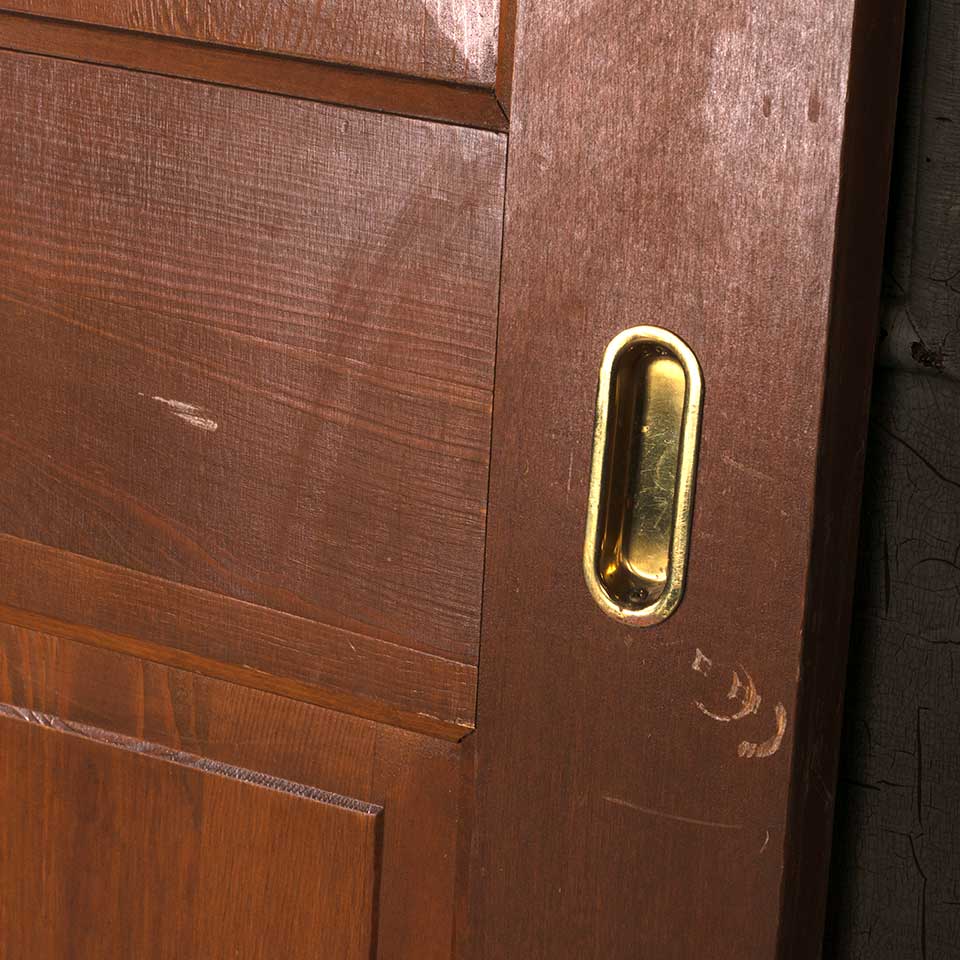 Architectural salvage vintage six panel pine wood pocket door with recessed brass finger pull hardware measuring approx. 30" wide x 78 1/2" tall x 1 3/8" thick. See photos to evaluate condition.