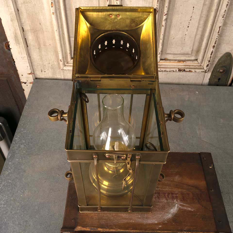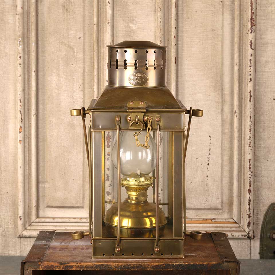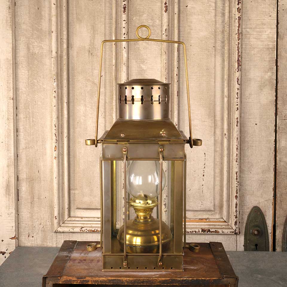 Brass Nautical kerosene lamp measuring approx. 9" wide x 14 1/2" tall x 6 1/2" front to back. See photos to evaluate condition.