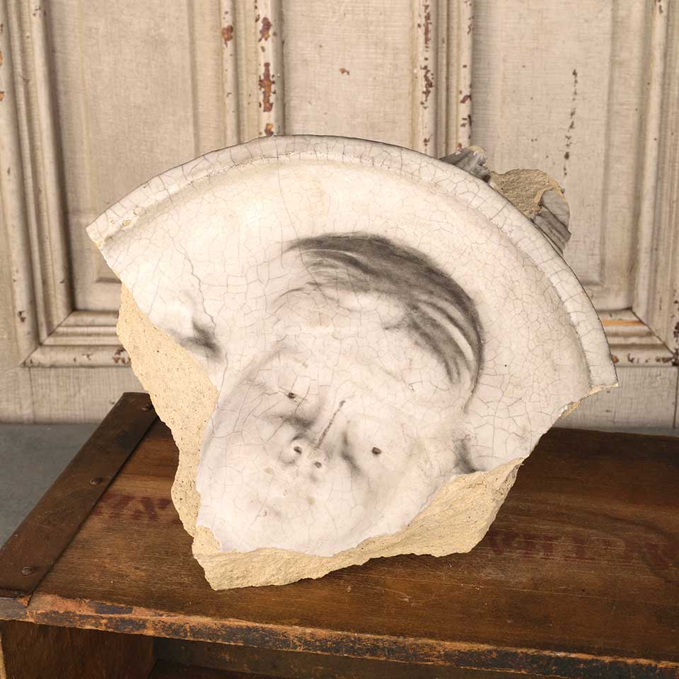 Architectural salvage terra cotta building ornament artifact with figural motif measuring approx. 9 1/2" wide x 10" tall x 5 3/4" front to back. This piece was originally part of the Peruna Drug/Medicine Company Building in Columbus, Ohio lost in 1973. See photos to evaluate condition.