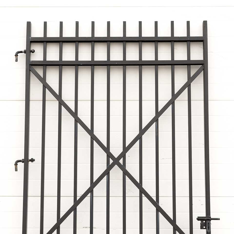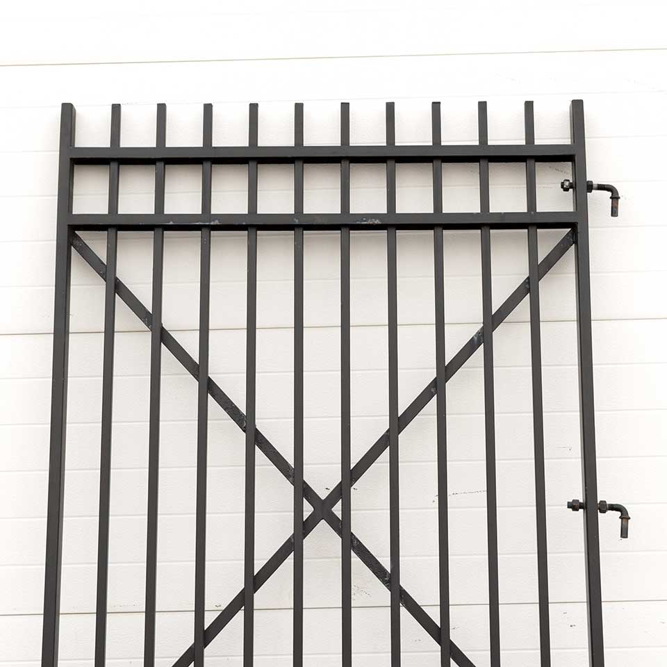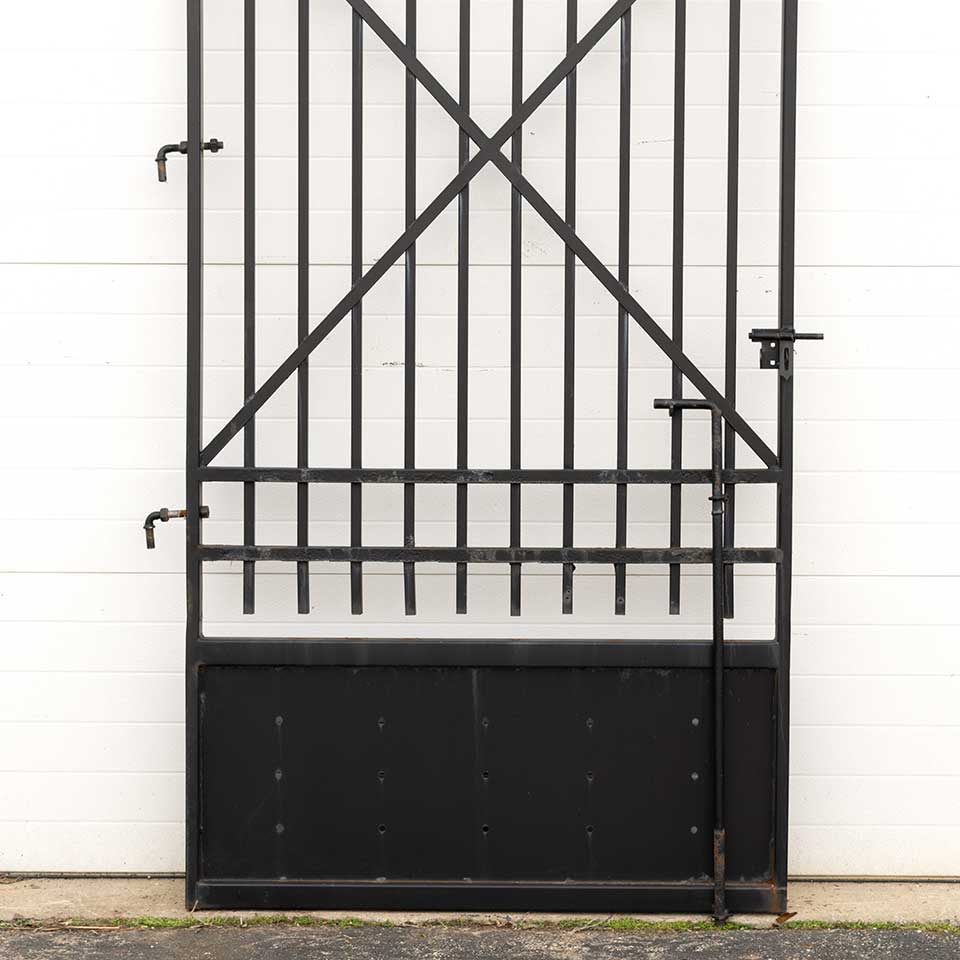 Architectural salvage large iron gate measuring approx. 45 1/4" wide x 92 1/2" tall x 2" front to back. See photos to evaluate condition.