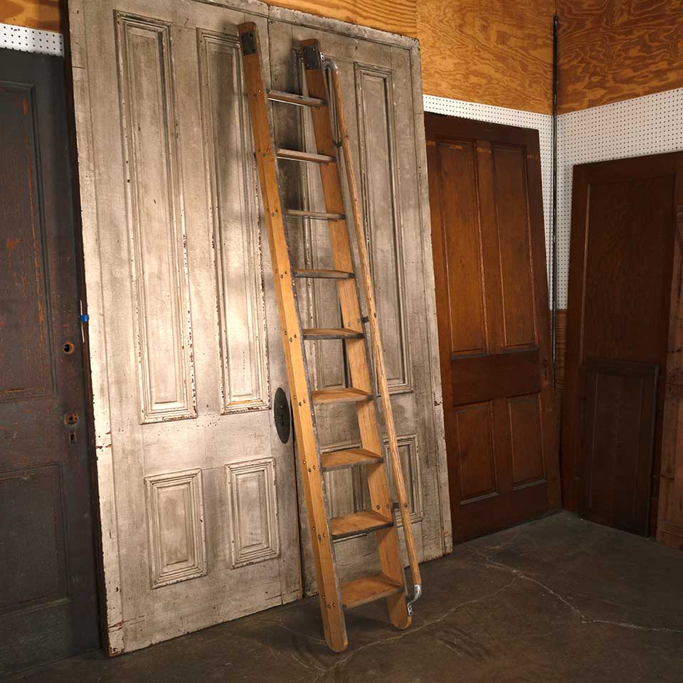 Architectural salvage nine rung oak wood library step ladder with handle measuring approx. 14" wide x 105 1/4" tall x 8 1/2" front to back. See photos to evaluate condition.