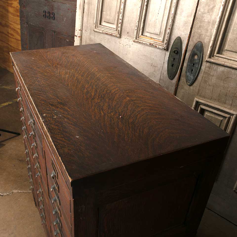 Antique Globe four piece oak stackable 36 drawer storage unit measuring approx. 33" wide x 38" tall x 17 1/4" front to back. The set includes a top, two 18 drawer units, and a base. One of the brass label handles is missing. See photos to evaluate condition.
