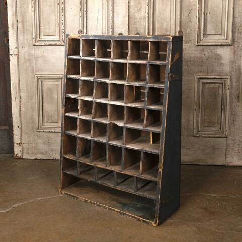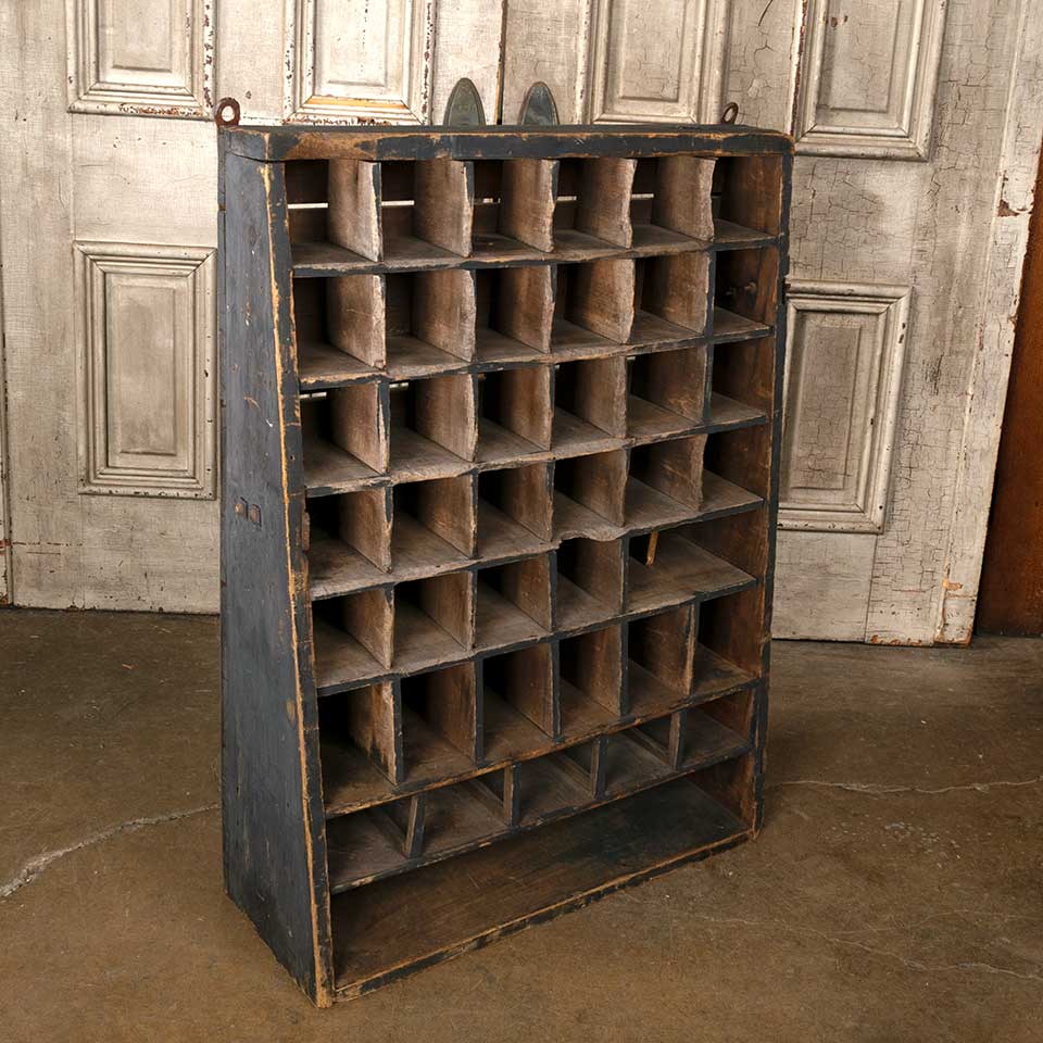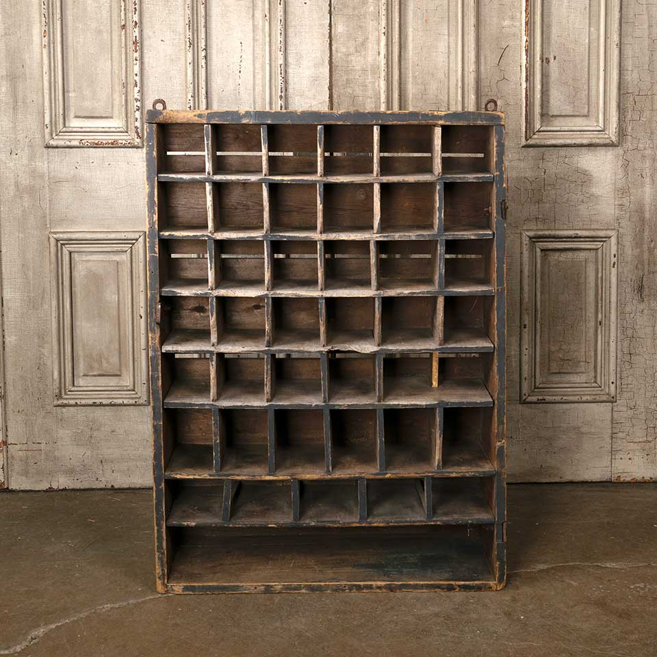 Antique primitive painted wood wall hung wood cubby cabinet unit measuring approx. 28 1/4" wide x 38 1/4" tall x 10 1/4" front to back. There's some missing and loose material. See photos to evaluate condition.