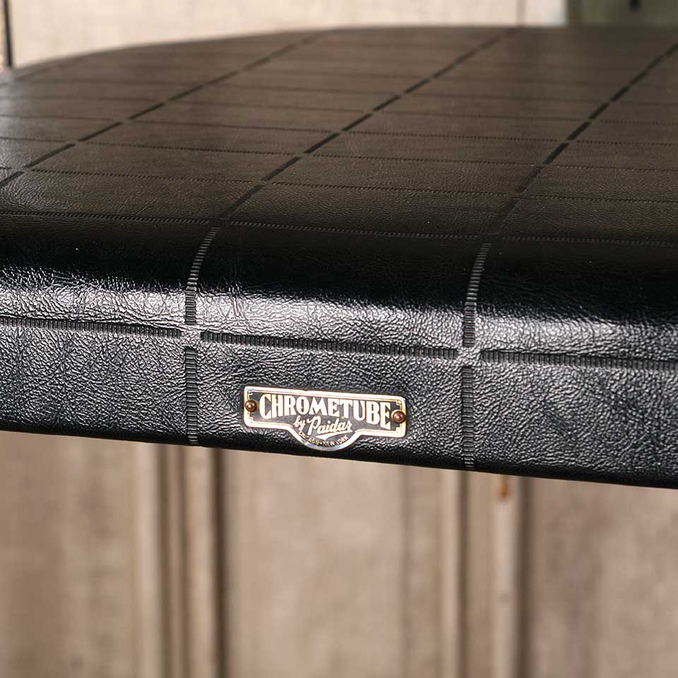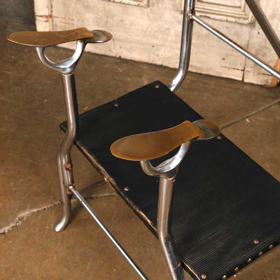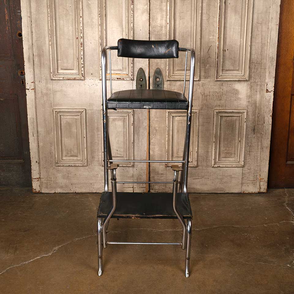 Vintage CHROMETUBE shoeshine stool highchair with brass foot rests measuring approx. 20 3/4" wide x 47 3/8" tall x 35 1/2" front to back. Manufactured by Paidar Chicago - New York. This would make a great chair for a barber shop, tattoo parlor or used as a pool table chair. The back upholstery is cracked. See photos to evaluate condition.