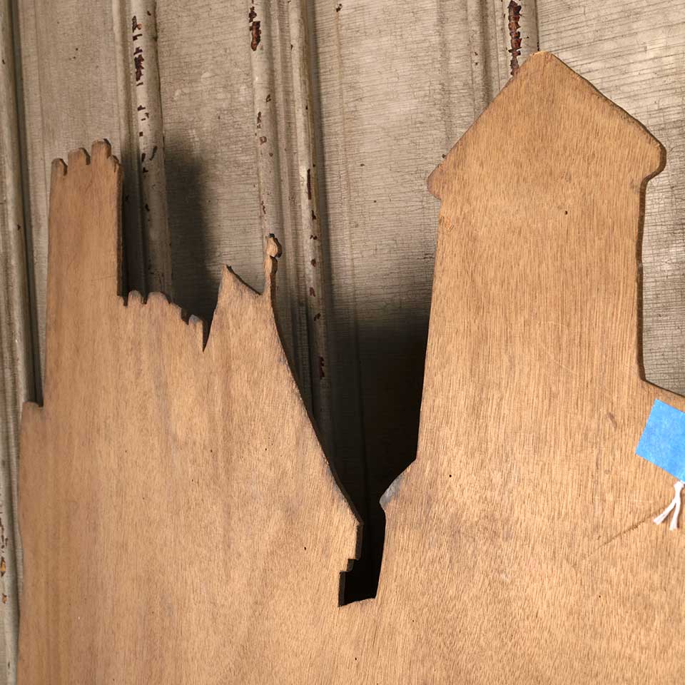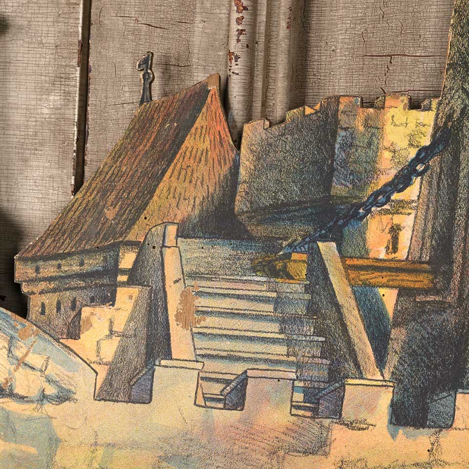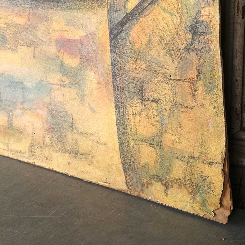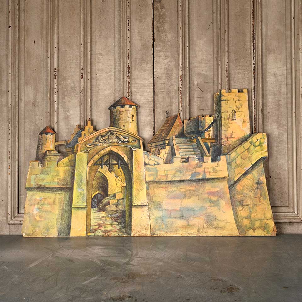 Antique castle scene stage prop painted on wood measuring approx. 47 1/2" wide x 28" tall x 1/8" front to back. See photos to evaluate condition.