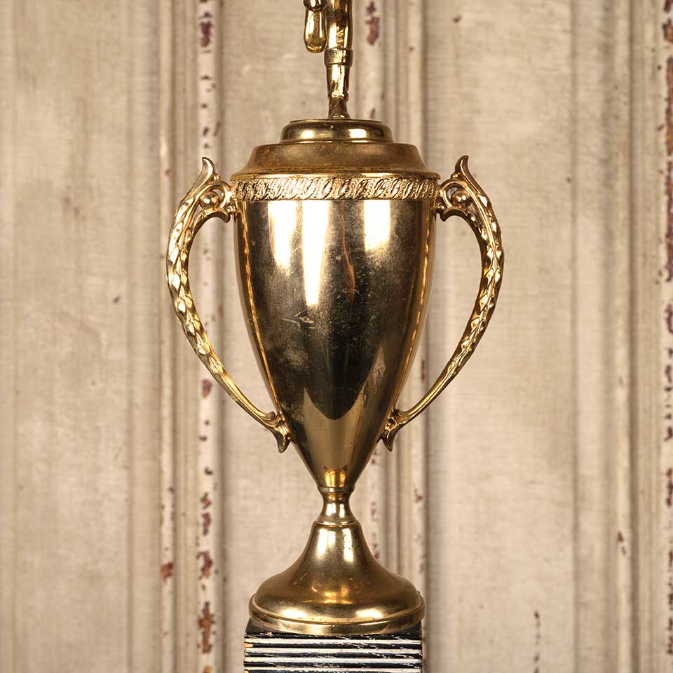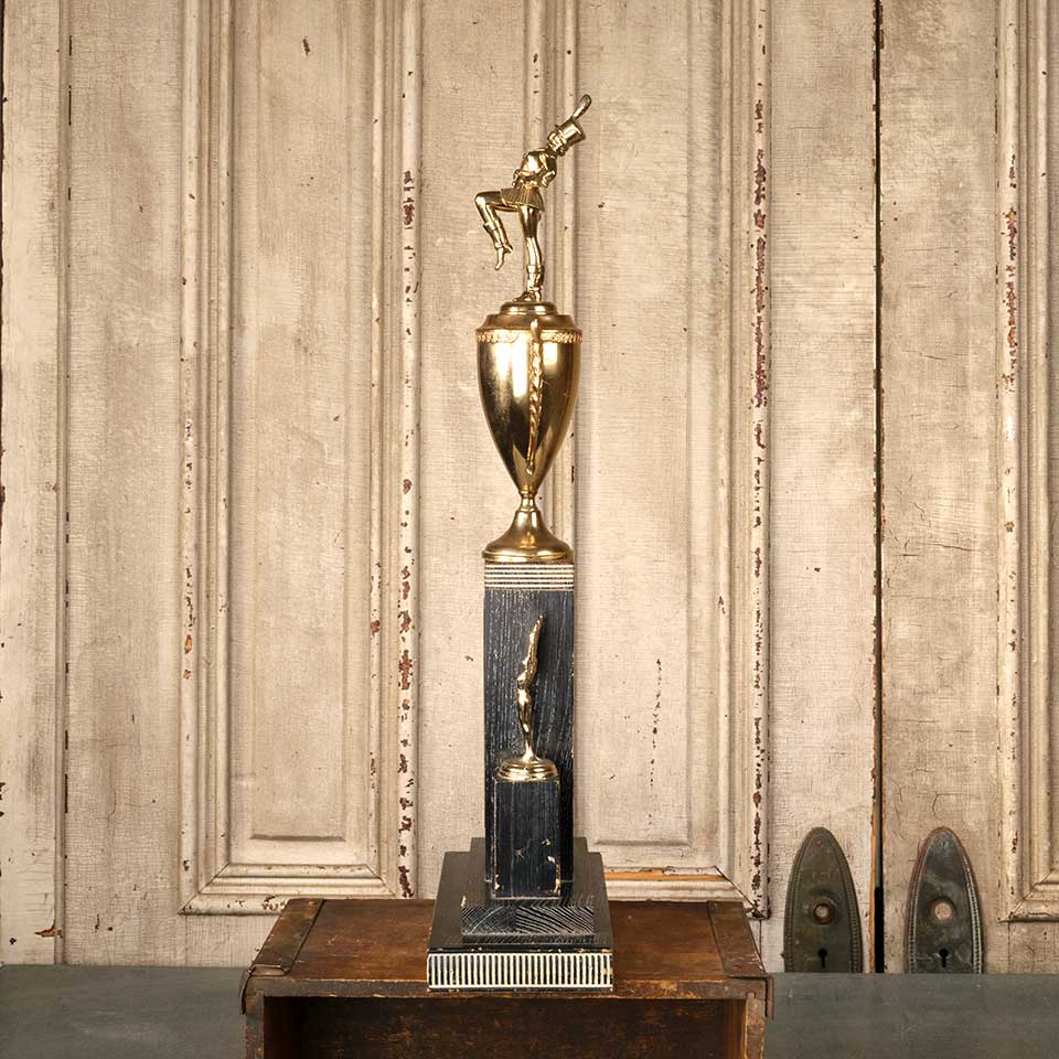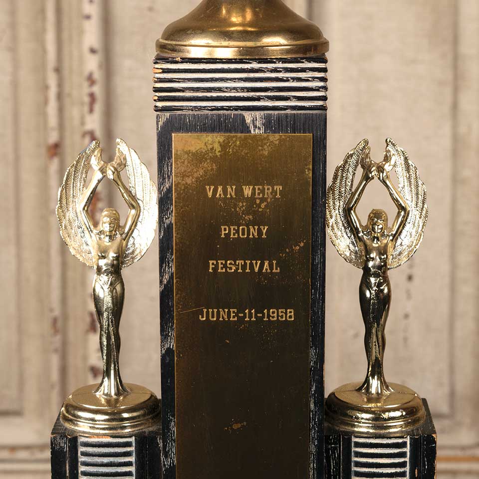 Antique marching band trophy with cast metal majorette finial topper measuring approx. 24" tall with a 10 1/4" x 5" wood base. The trophy is engraved as follows: VAN WERT PEONY FESTIVAL JUNE - 11 - 1958. See photos to evaluate condition.