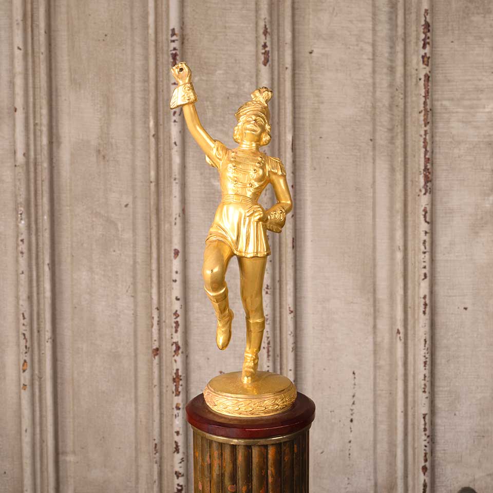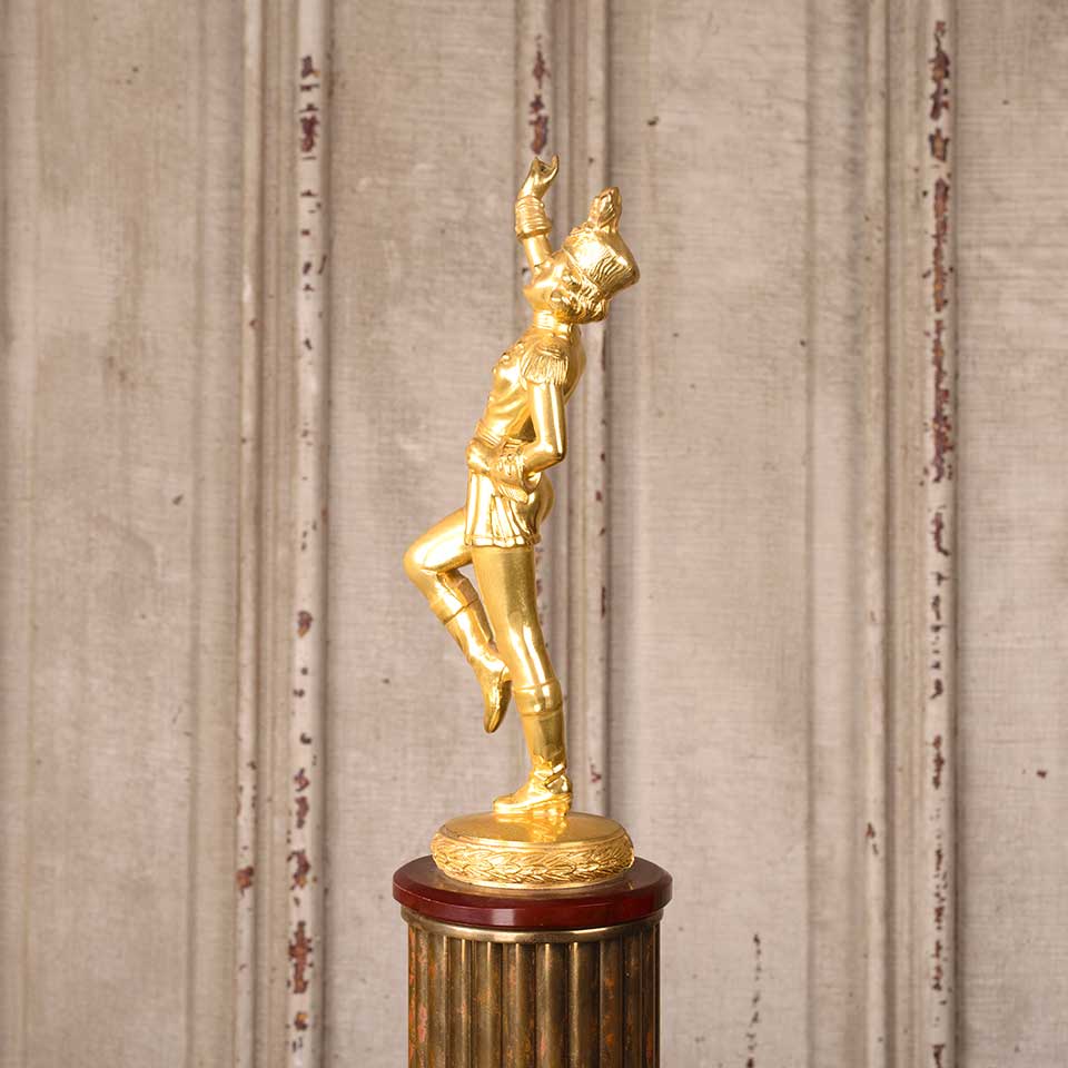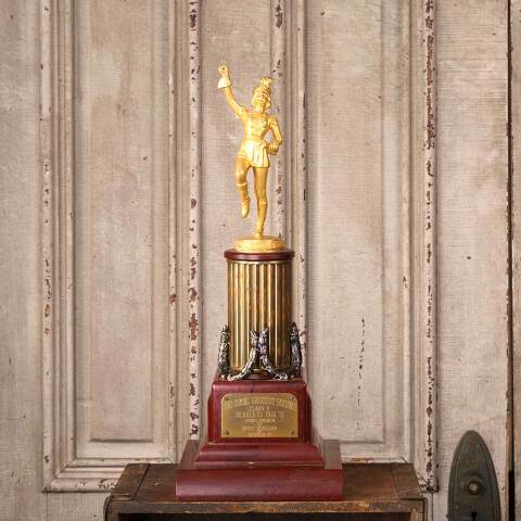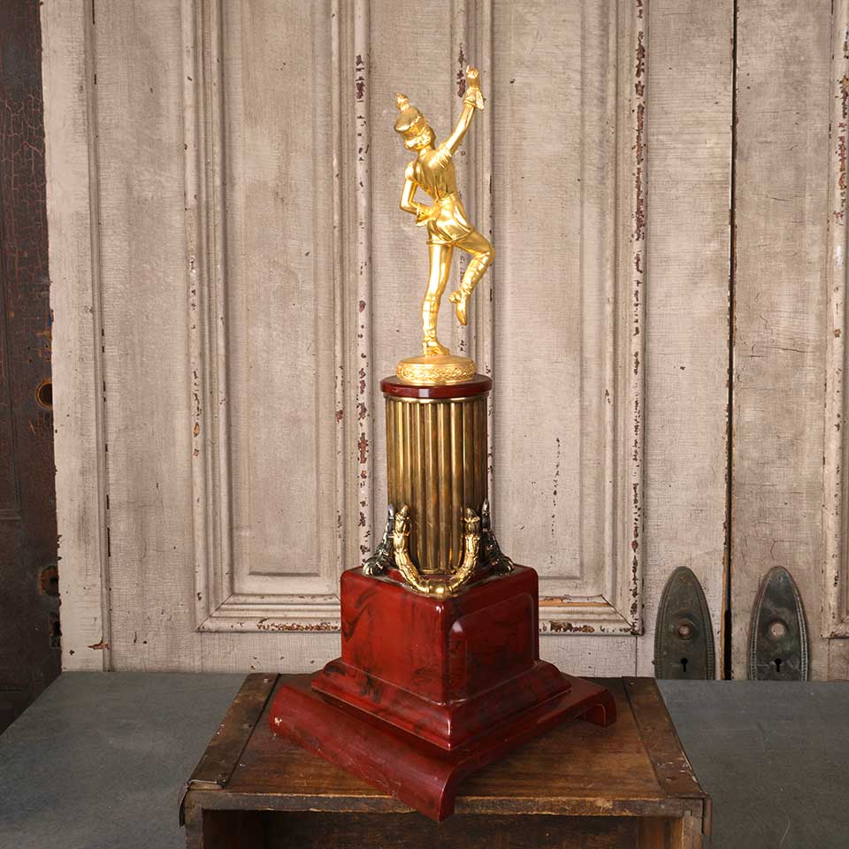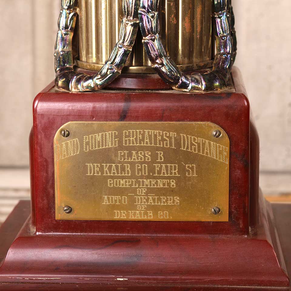 Antique marching band trophy with cast metal majorette finial topper measuring approx. 19 1/2" tall with a 7 1/2" x 7 3/4" base. The trophy is engraved as follows: BAND COMING GREATEST DISTANCE CLASS B DE KALB CO. FAIR '51 COMPLIMENTS OF AUTO DEALERS OF DE KALB CO. The original baton is missing. See photos to evaluate condition.