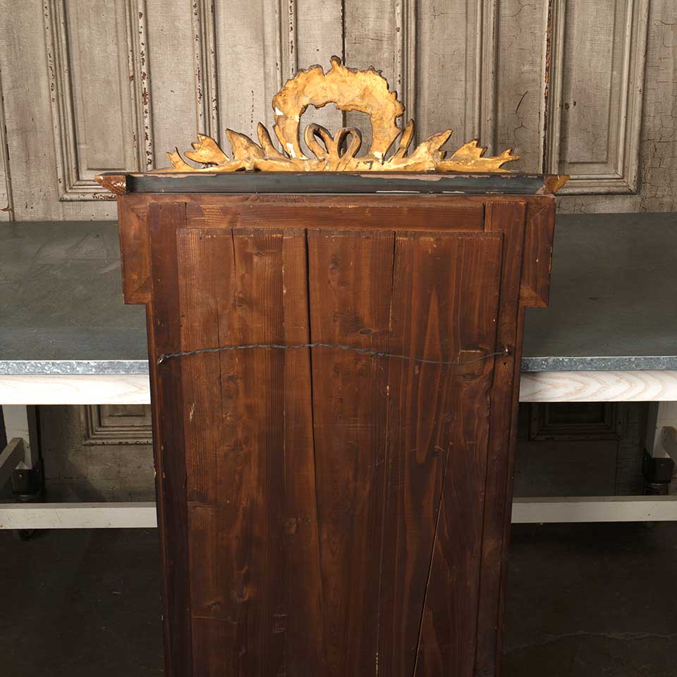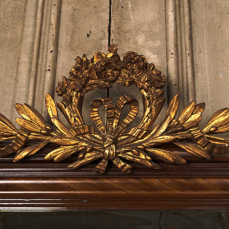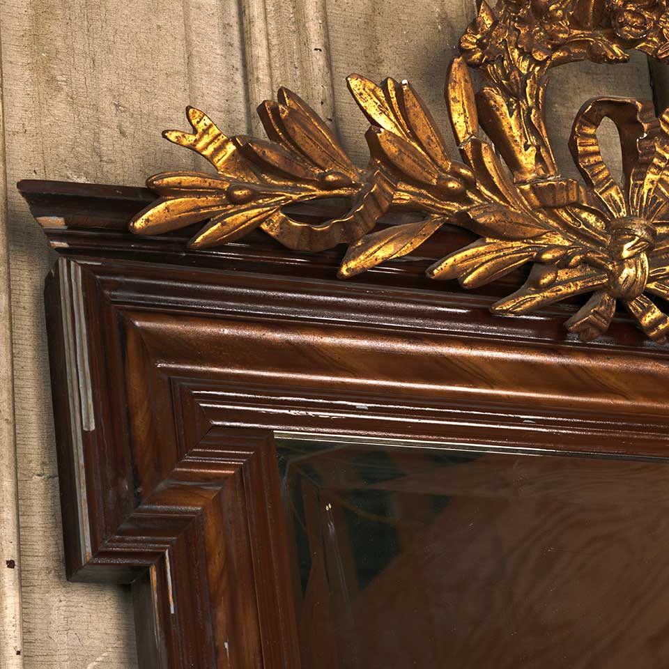 Architectural salvage antique beveled glass mirror with ornate pediment measuring approx. 27" wide x 51" tall x 5" front to back. There's some material loss on the edges and the top left return trim piece is missing. See photos to evaluate condition.