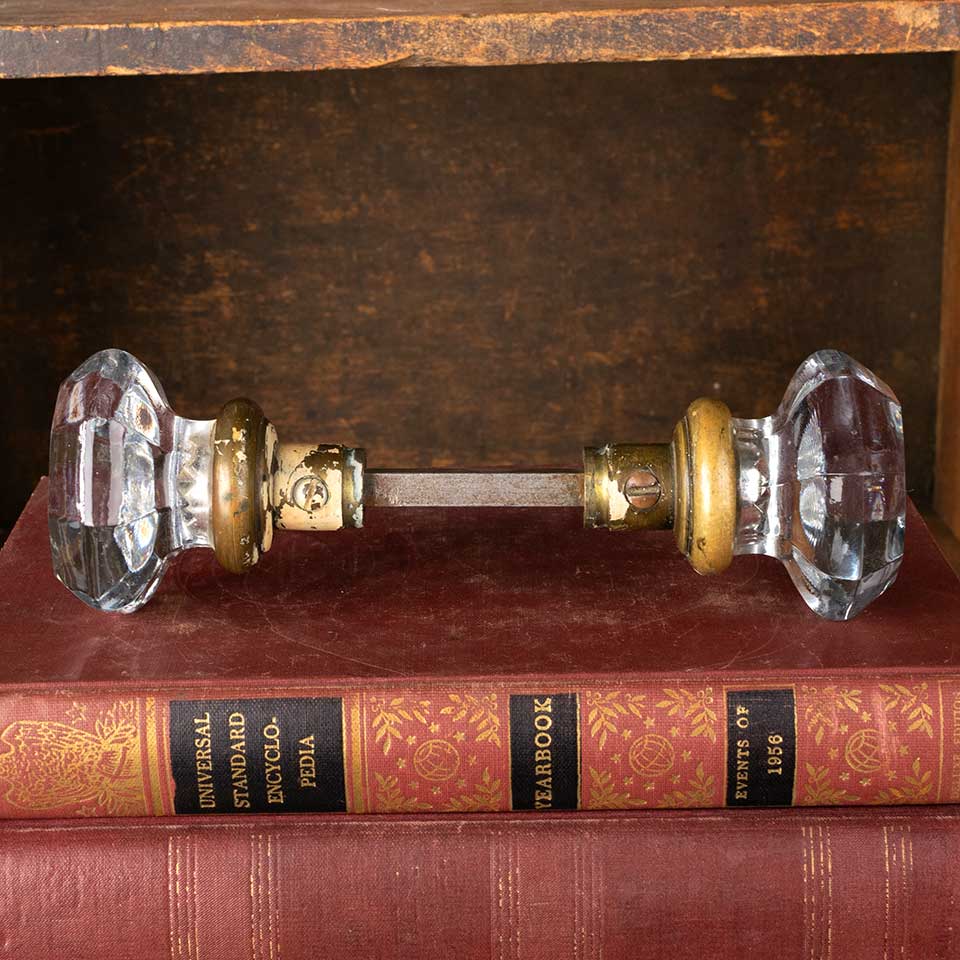 Pair of architectural salvage antique octagonal glass and brass doorknobs door hardware each measuring approx. 2 1/4" in diameter with a3/4" diameter stem. Includes a tapped doorknob spindle with set screws.
