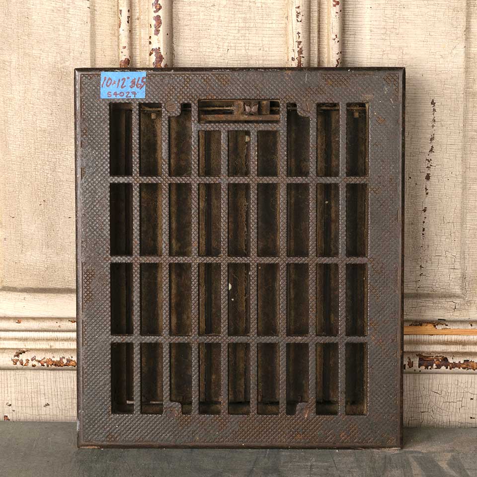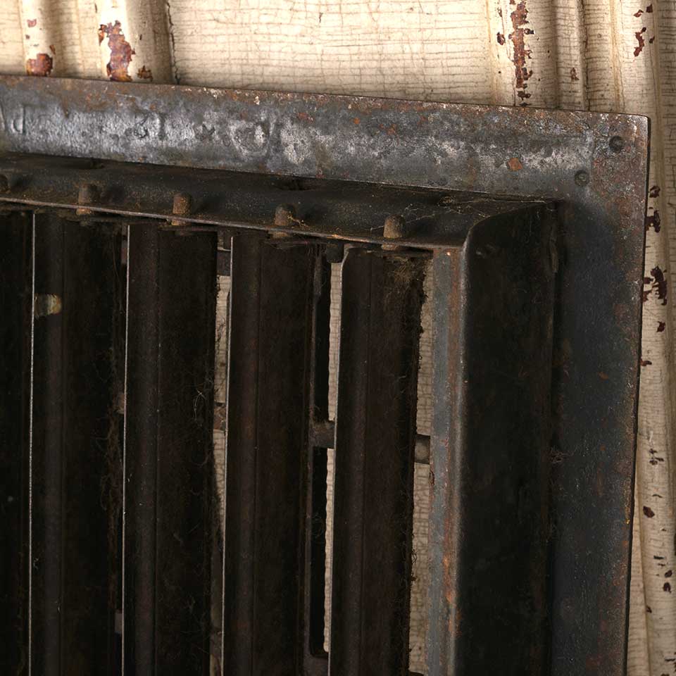 Architectural salvage antique cast iron heat grate floor vent cover with operable louvers measuring approx. 10" x 12" (insert dimensions) and 12" x 14" (overall dimensions). See photos to evaluate condition.