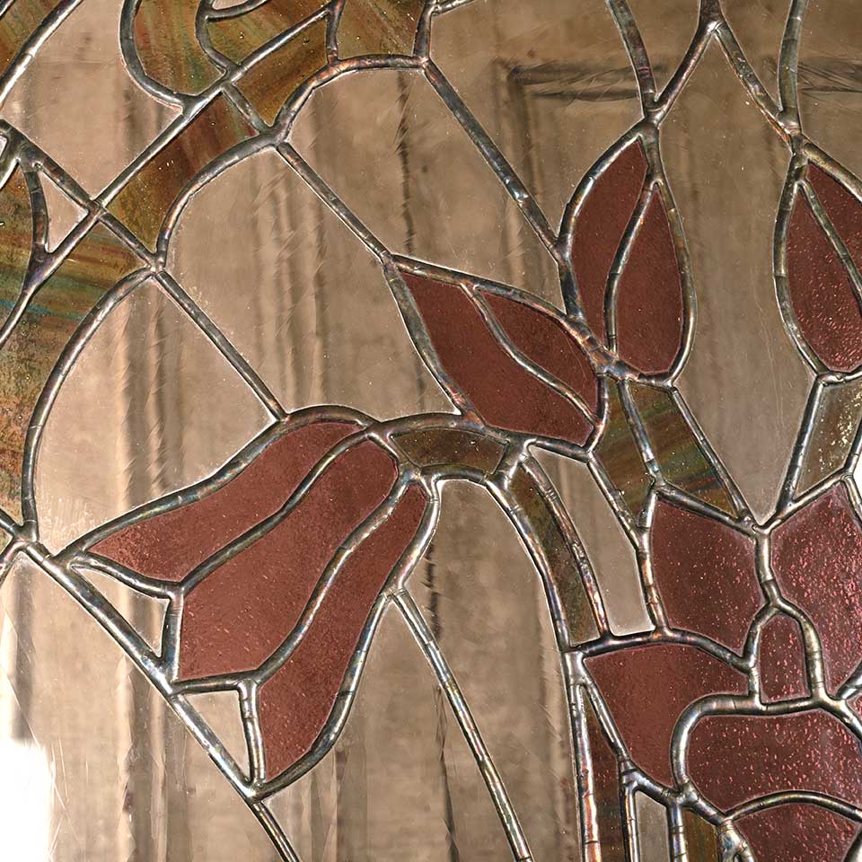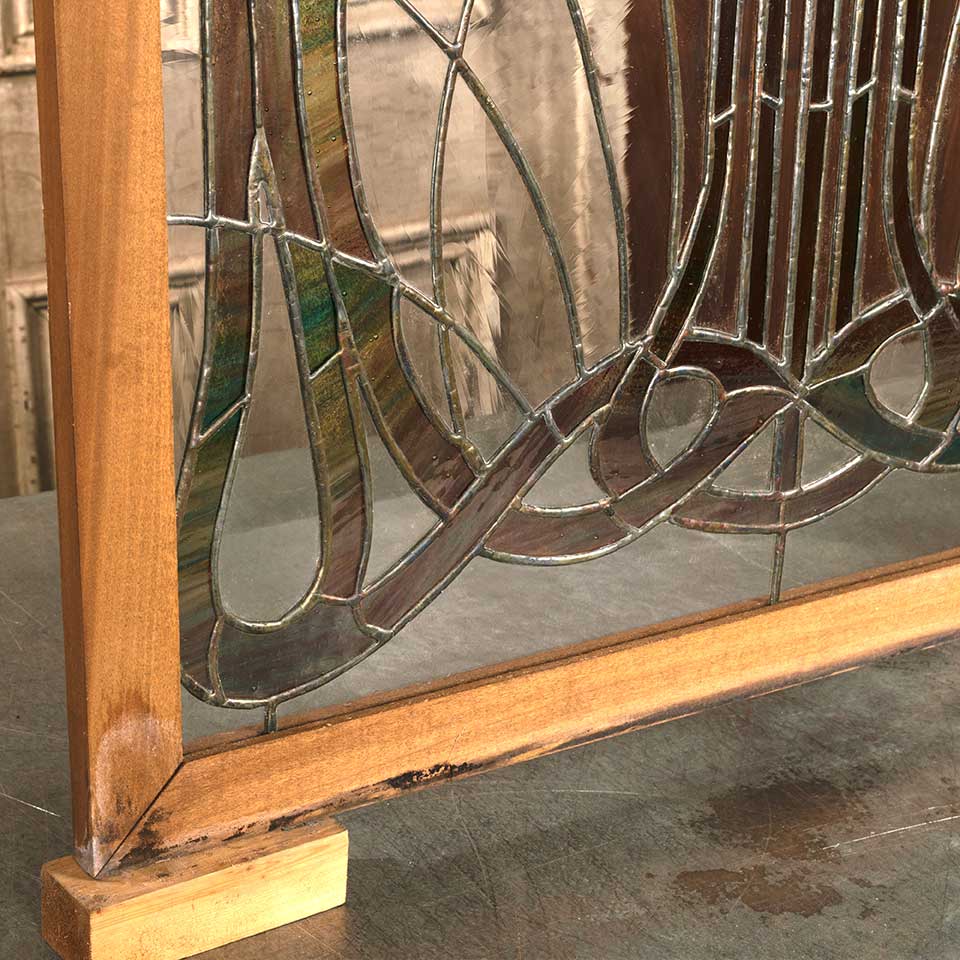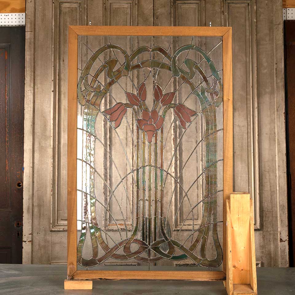Architectural salvage vintage wood framed stained glass window panel measuring approx. 29 15/16" wide x 30 1/8" tall x 3/4" front to back. See photos to evaluate condition.