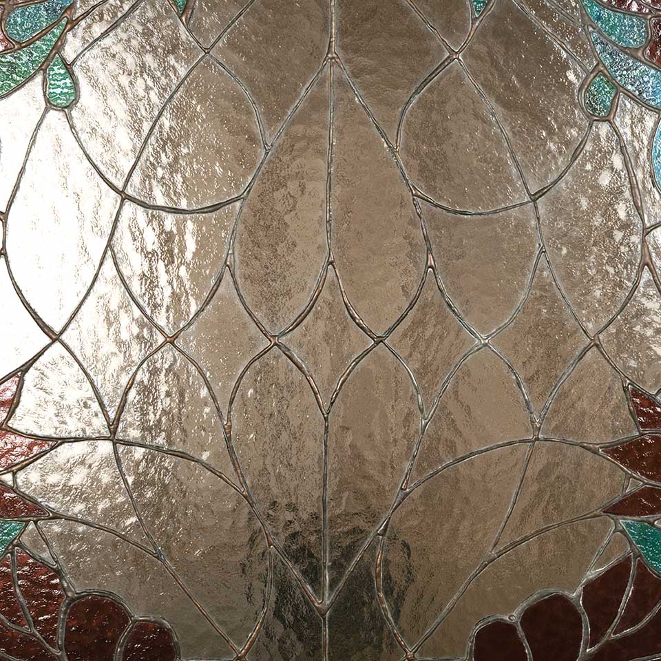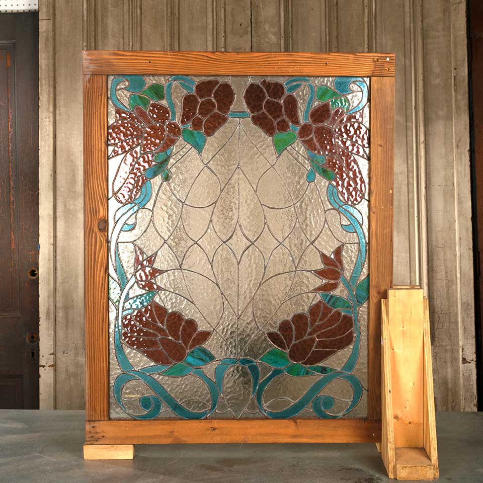 Architectural salvage vintage wood framed stained glass window panel measuring approx. 31 1/2" wide x 39 7/8" tall x 1 3/8" front to back. See photos to evaluate condition.