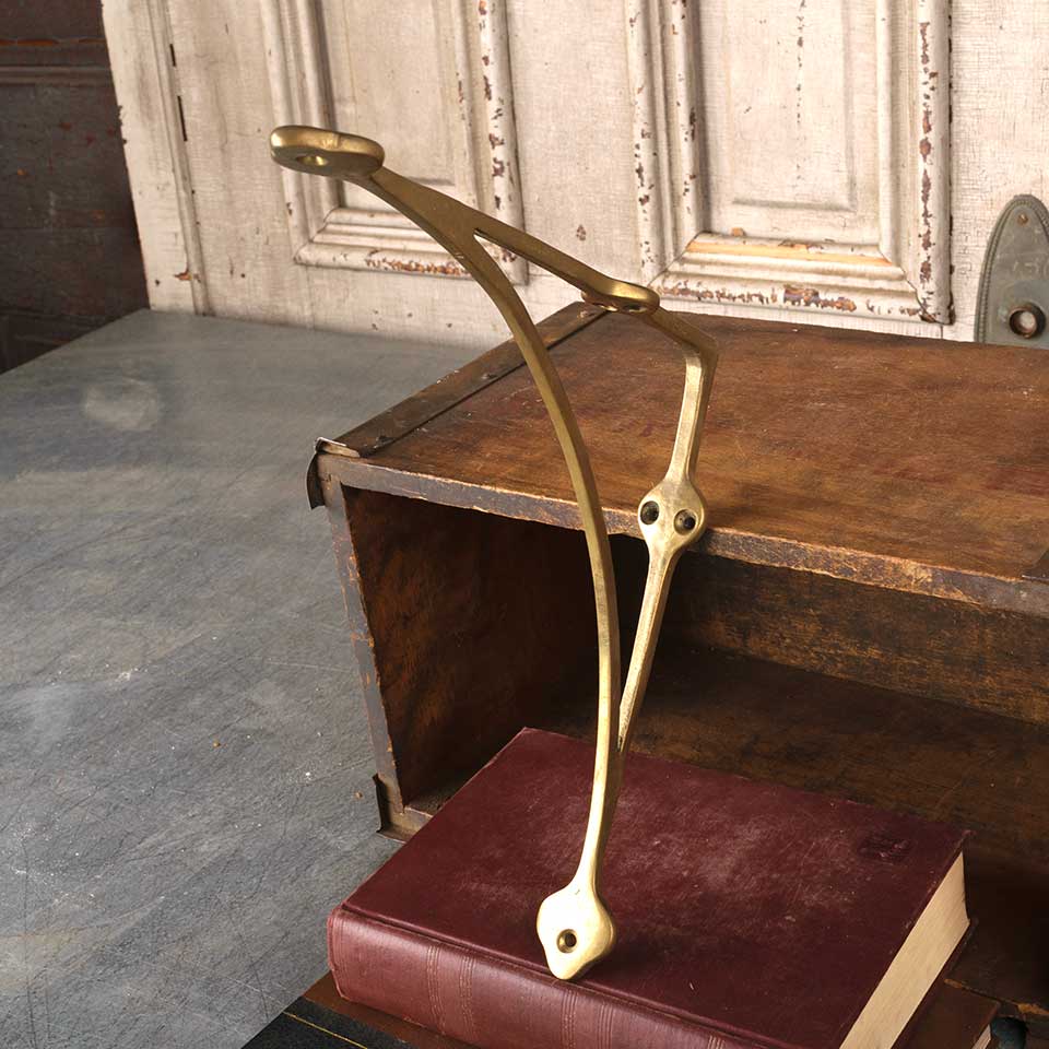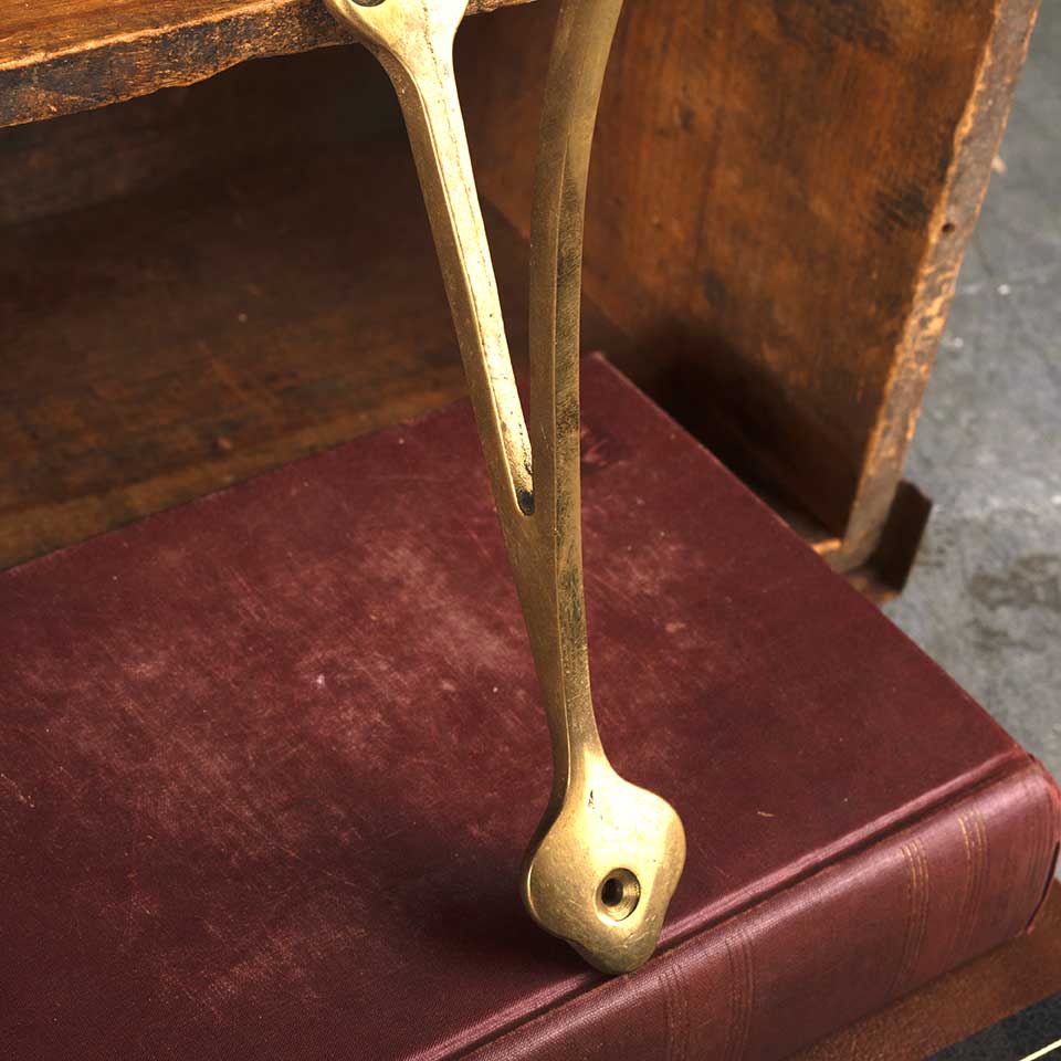 Architectural salvage vintage solid brass shelf bracket measuring approx. 1 1/8" wide x 9 3/4" tall x 9 3/4" front to back. Color and condition may vary.