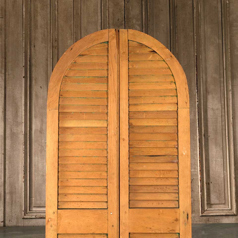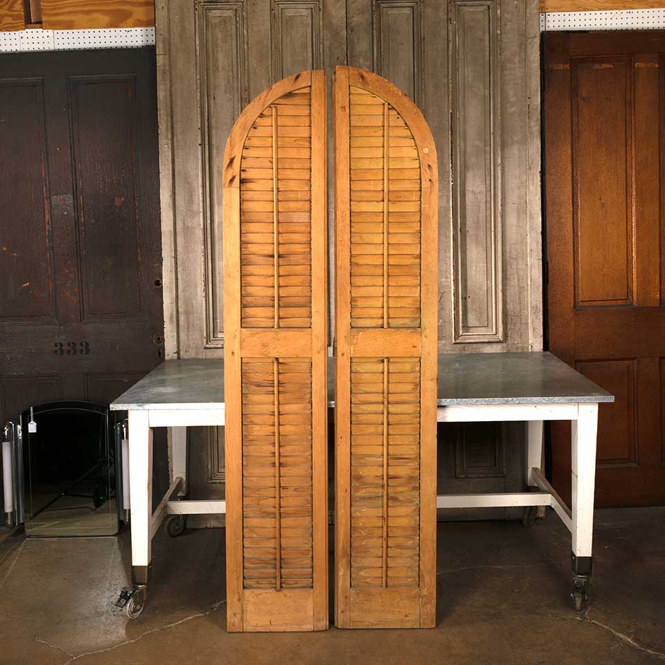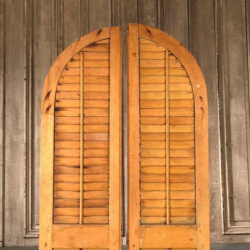 Set of two architectural salvage antique exterior arched top louvered wood shutters together measuring approx. 28 3/4" wide x 79 1/4" tall x 1 1/2" thick. See photos to evaluate condition.