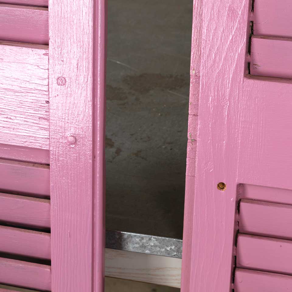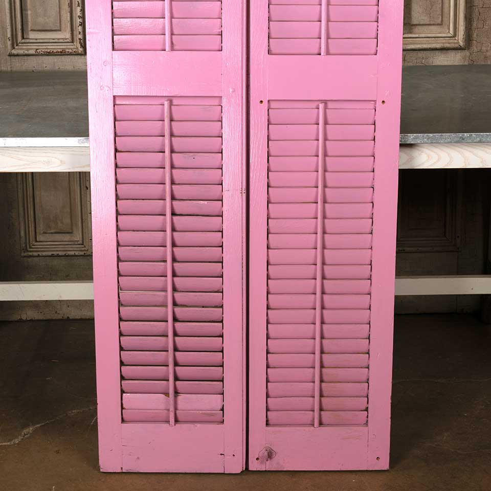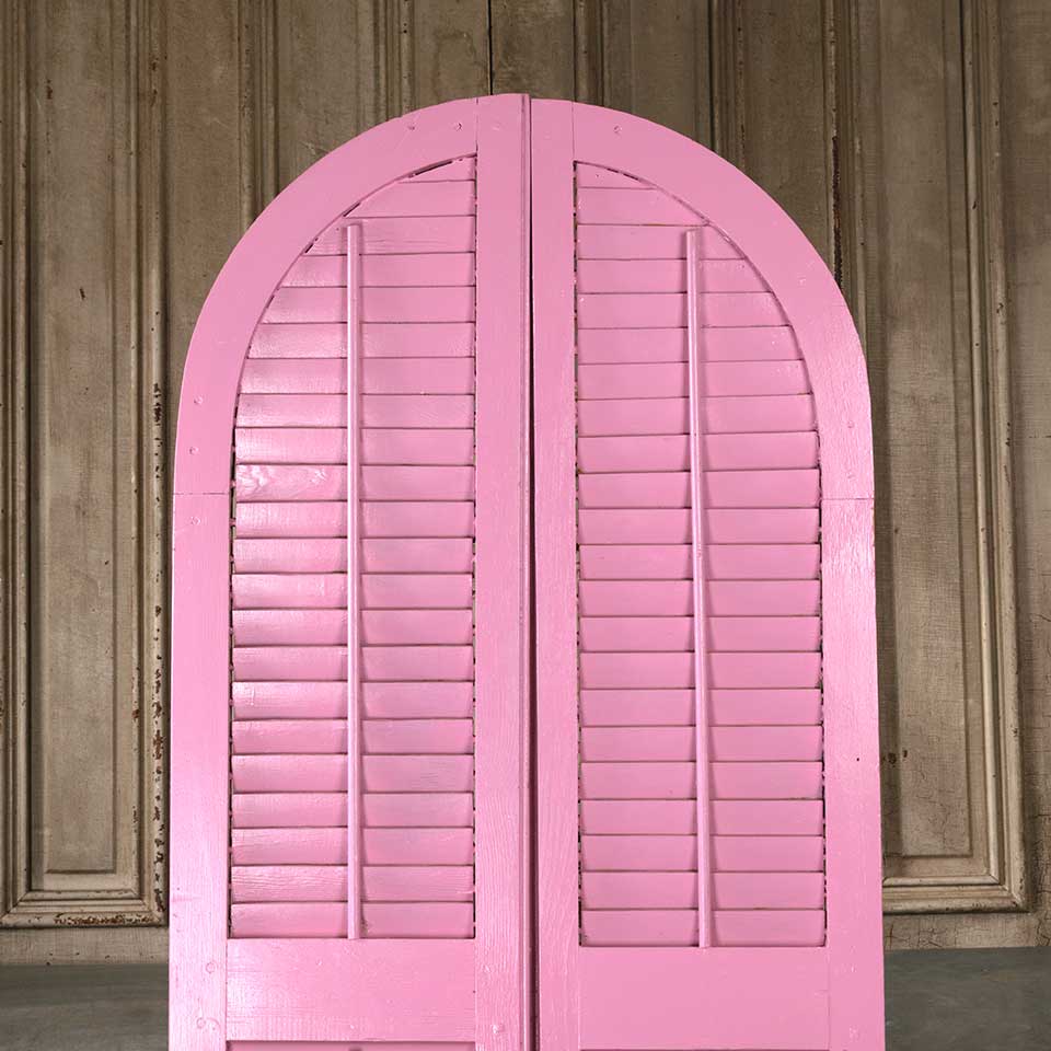 Set of two architectural salvage antique exterior arched top louvered wood shutters together measuring approx. 28 1/2" wide x 75 1/8" tall x 1 1/2" thick. This set is painted on one side and natural on the other. See photos to evaluate condition.
